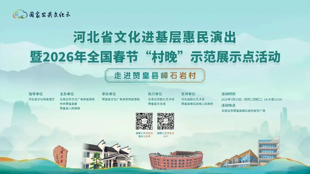 2026年3月20日(农历二月初二)14:30至16:00,由河北省文化和旅游厅指导,石家庄市文化广电和旅游局、中共赞皇县委、赞皇县人民政府主办,赞皇县文化广电体育和旅游局承办,石家庄市群众艺术馆、赞皇县文化馆执行,河北省群众艺术馆、赞皇县嶂石岩镇人民政府支持的“春醒燕赵·山水赞皇”河北省文化进基层惠民演出暨2026年全国春节“村晚”示范展示点活动走进赞皇县嶂石岩村活动即将在石家庄市赞皇县嶂石岩村岩艺广场火爆开演。