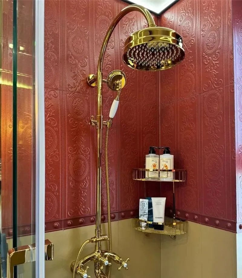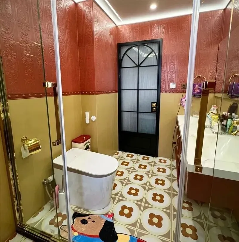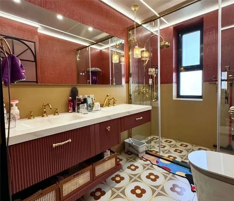 一 开始我还真没觉得有啥不一样,看视频那一眼,说没毛病,就是复古瓷砖,花花绿绿的,地砖拼色挺大胆的,刚进门突然映入眼帘的一组绿色瓷片墙,第一感觉挺冲击的,这种撞色搭配吧,如果没审美点,真的挺容易踩雷,然后粉色马桶,金色毛巾架,暖黄色灯光,啥都想挤一起,气氛确实到位,问题也明显,这种风格想玩明白,不光要预算,还得会搭色,纯看图片可能还感觉挺浪漫,现实中站进去感受完全不同。