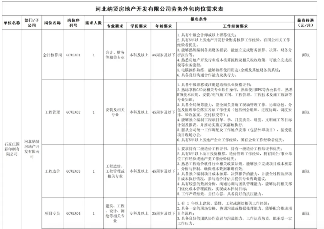 石家庄市国经人力资源管理有限公司招聘公告——河北纳贤房地产开发有限公司劳务外包项目