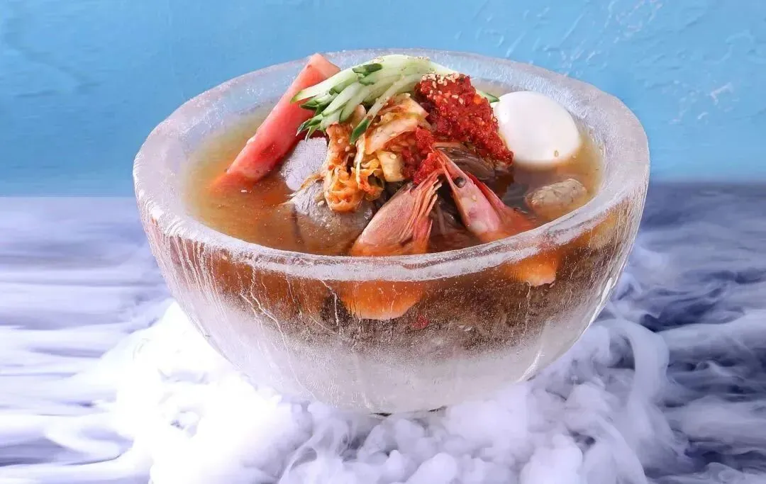 冷面:现压的荞麦面筋道弹牙,浸在带冰碴儿的酸甜牛肉清汤里,搭配苹果片、梨片、辣白菜、黄瓜丝,酸甜中带微辣。吸溜一口,冰爽口感直钻喉咙,配上锅包肉,绝了!