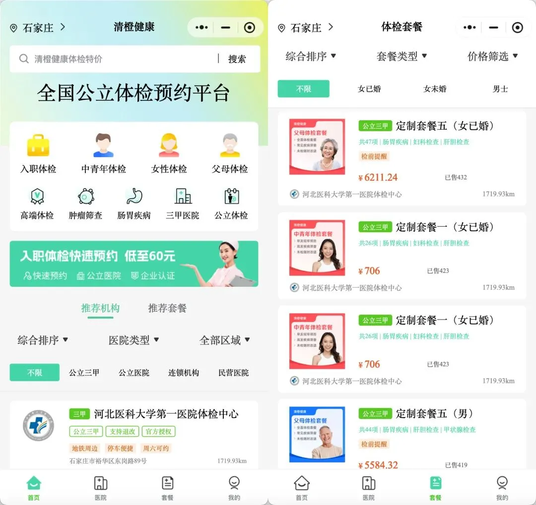 大家可以通过清橙健康小程序预约各大三甲医院的体检套餐,全国200+城市,1400+多家三甲医院授权预约。