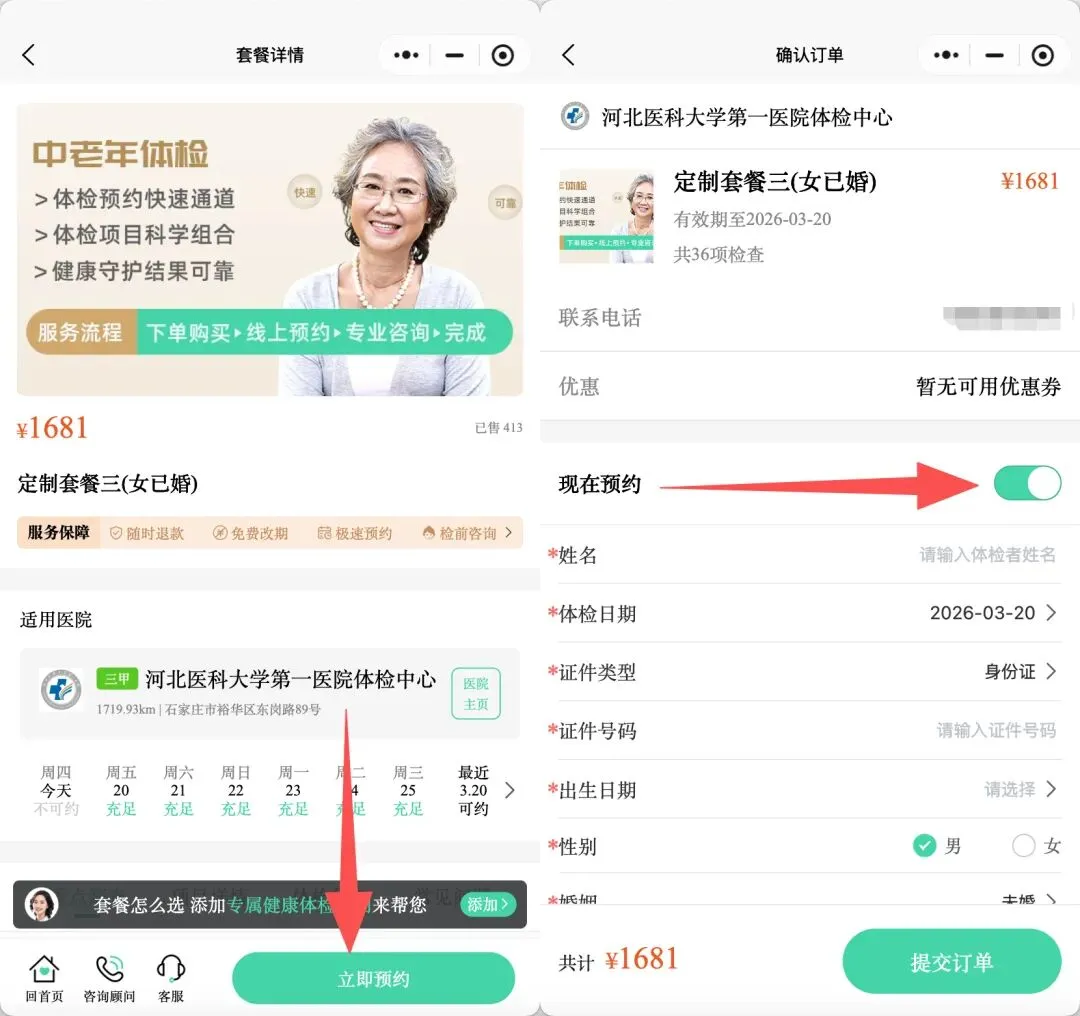 点击相应套餐右下角的【立即购买】,勾选【现在预约】按钮,填写体检人信息、体检日期等,立即支付,即可完成预约。