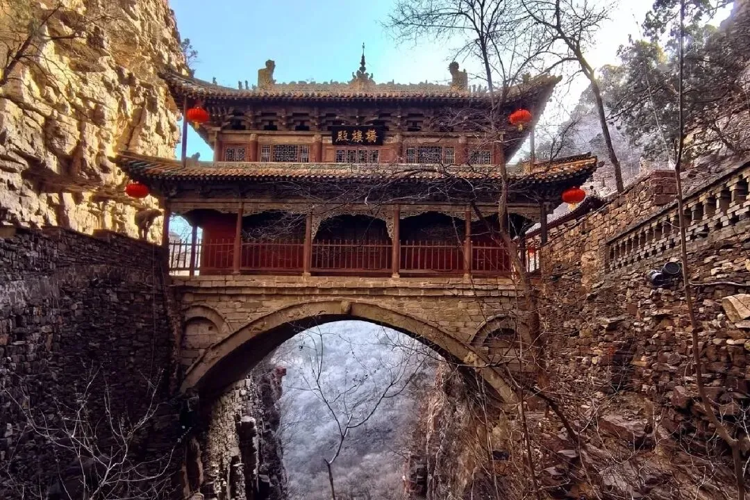 桥楼殿是苍岩山风景极佳之处。这里双峰对峙,峭壁巍然,中开一线,下临百丈深涧。在崖壁上凌空习架着三座单孔石桥。据考证建于隋代,其中间一座长15米,空约9米,上面建有桥楼殿,宽五间,深三间,为两层九脊楼阁式建筑,四周围以出廊,重檐歇山顶,檐角高翘,琉璃瓦顶,黄绿相间。正脊两吻间还有仙人跨龙、狮子驮塔等饰件。结构精巧,风格独特,具有清代早期的建筑特点。殿内有佛、菩萨、十八罗汉像及壁画。古人赞美这一壮观景象:“千丈虹桥望入微,天光云彩共楼飞”。
