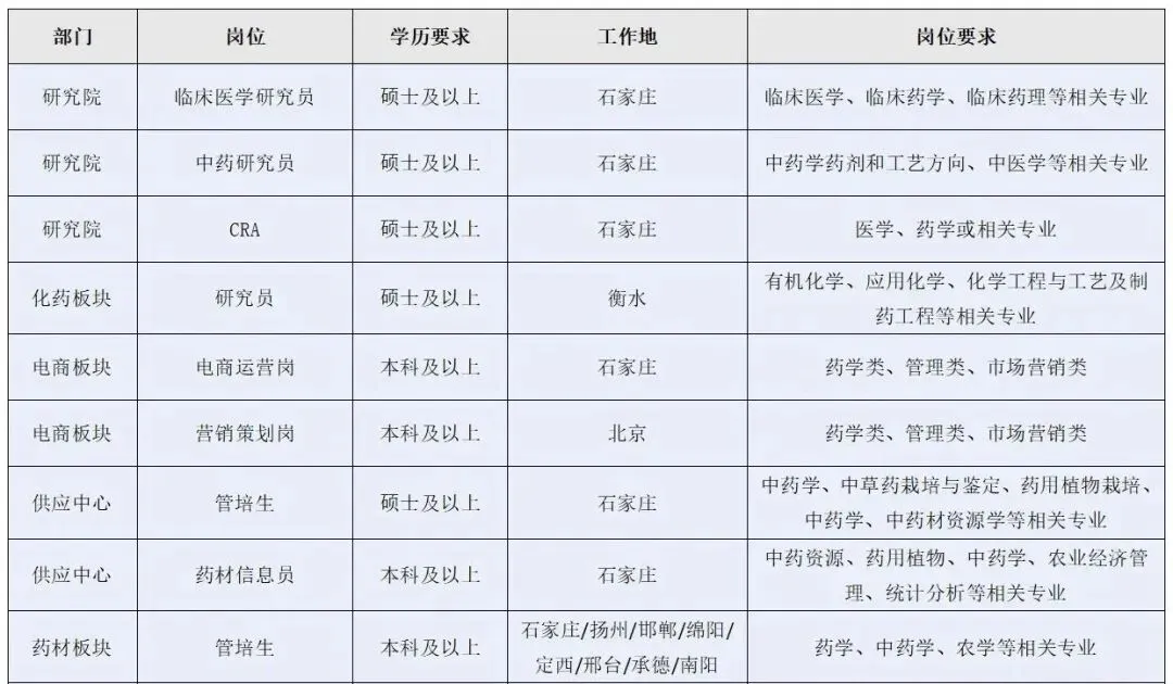 >石家庄药企3月专场招聘:医院医生+CRA+医学研究员+药材管培生+电商运营+产品助理