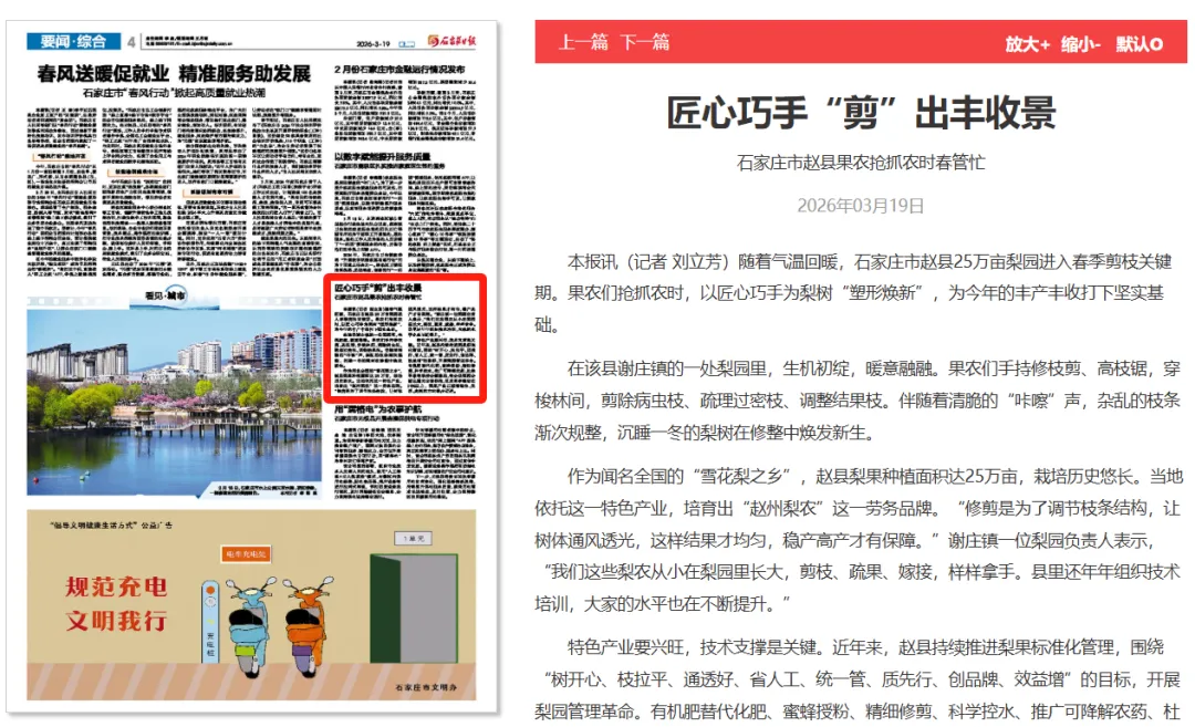 作为闻名全国的“雪花梨之乡”,赵县梨果种植面积达25万亩,栽培历史悠长。当地依托这一特色产业,培育出“赵州梨农”这一劳务品牌。“修剪是为了调节枝条结构,让树体通风透光,这样结果才均匀,稳产高产才有保障。”谢庄镇一位梨园负责人表示,“我们这些梨农从小在梨园里长大,剪枝、疏果、嫁接,样样拿手。县里还年年组织技术培训,大家的水平也在不断提升。”