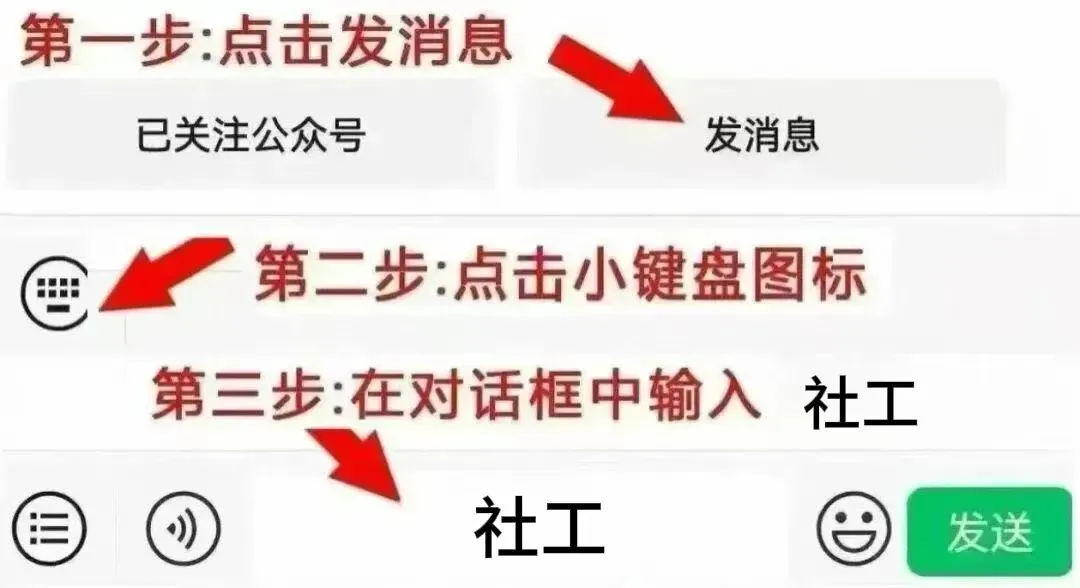 第二步:点击手机界面键盘然后输入“社工”两字,点击发送就可以获取想要的公告等岗位信息