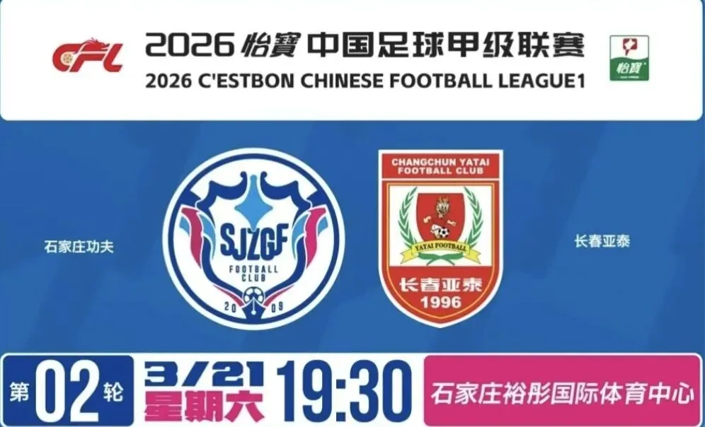 2026 赛季中甲联赛第 2 轮,3 月 21 日,周六,19:30,石家庄裕彤国际体育中心,石家庄功夫 VS 长春亚泰,这是新赛季石家庄功夫的第一个主场比赛,面对的是上赛季还在中超的长春亚泰,绝对是一场遭遇战,而且是很难缠的对手,必须全力以赴,希望功夫的三名新外援:康拉德、多米尼克、比达尔,都能取得进球,功夫能否重振“魔鬼主场”的雄风,让我们拭目以待吧!