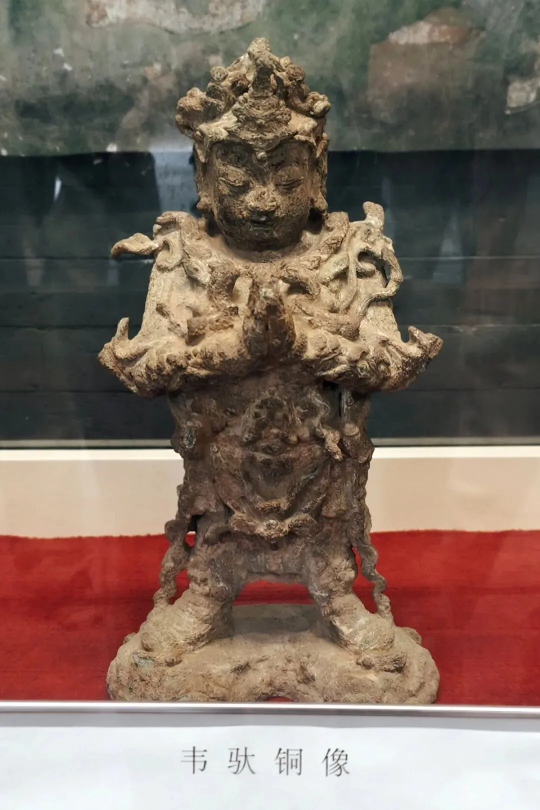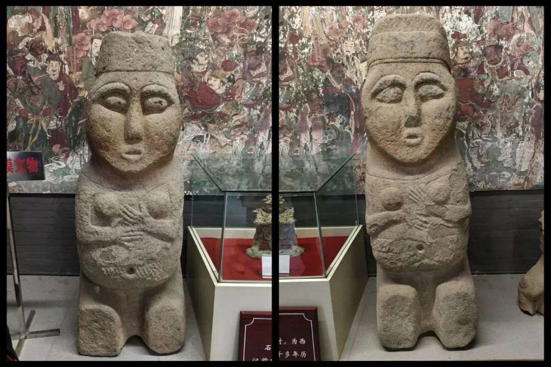 前面提到过,壁画是分上中下三层排列,以上均是局部。这张西壁的照片可以整体地了解一下壁画的结构。展厅内西壁壁画前还有两尊石刻造像,这两尊看似不起眼的人物造像石刻是汉代作品,距今两千多年,1982年出土于石家庄小安舍村,为国家一级文物。小安舍村东距赵佗先人墓仅三公里,因此怀疑这两尊石像很有可能是赵佗先人墓前的遗物。汉文帝元年(前179),吕后死后,汉文帝刘恒即位,他派人重修了位于真定(今河北正定)的赵佗先人的墓地,以怀柔政策拉拢“南越武帝”赵佗,以达到全国统一的目的。石像用青石雕成,其一为男像,高175厘米,胸围205厘米;一为女像,高163厘米,胸围190厘米。两像造型近似,整体作跽[jì]坐状。头部比例较大,尖下巴,大眼直鼻小口,神态善良恭顺。男像单眼睑,女像双眼睑。双手交叉,抚于胸前,头戴平巾帻,其中女像帽顶下陷。腰间系带,身上无衣纹,裸体或身穿薄纱。整体造型简洁,雕刻粗犷,具有西汉雕刻艺术的典型特征。2025年6月,北京市石景山区永济寺首次对外开放,同时和毗卢寺合作,举办“壁上丹青——毗卢寺与法海寺的对话”展览,内容之一就是在永济寺正殿展出了毗卢殿壁画的复制品。