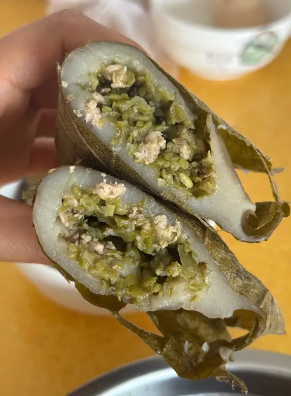 我问了做饼的大姐,她说关键不是馅多,而是蒸得透。玉米面和少量白面拌匀,加温水揉成团,包上豆馅或菜馅,用桲椤叶一裹,上锅大火蒸到叶香出来。揭盖那一下,叶子的清苦和面香混在一起,很耐吃。