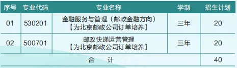 学院北京高职自主招生计划全部为订单招生计划,合作企业是中国邮政集团有限公司北京市分公司,毕业面向企业基层服务性岗位就业。入学后体检合格即签订三方培养就业协议,校企联合培养,毕业时符合协议要求合作企业接收就业。具体招生计划如下: