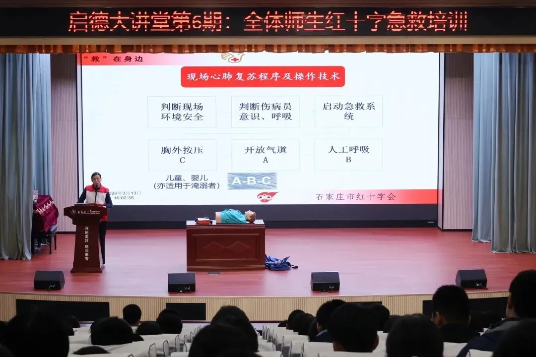 为进一步普及应急救护知识,提升全体师生自救互救能力,筑牢校园安全防线,石家庄二中启德校区于3月13日联合石家庄市红十字会,开展了一场全员覆盖、专业权威的应急救护专项培训。全校师生积极参与,认真学习。