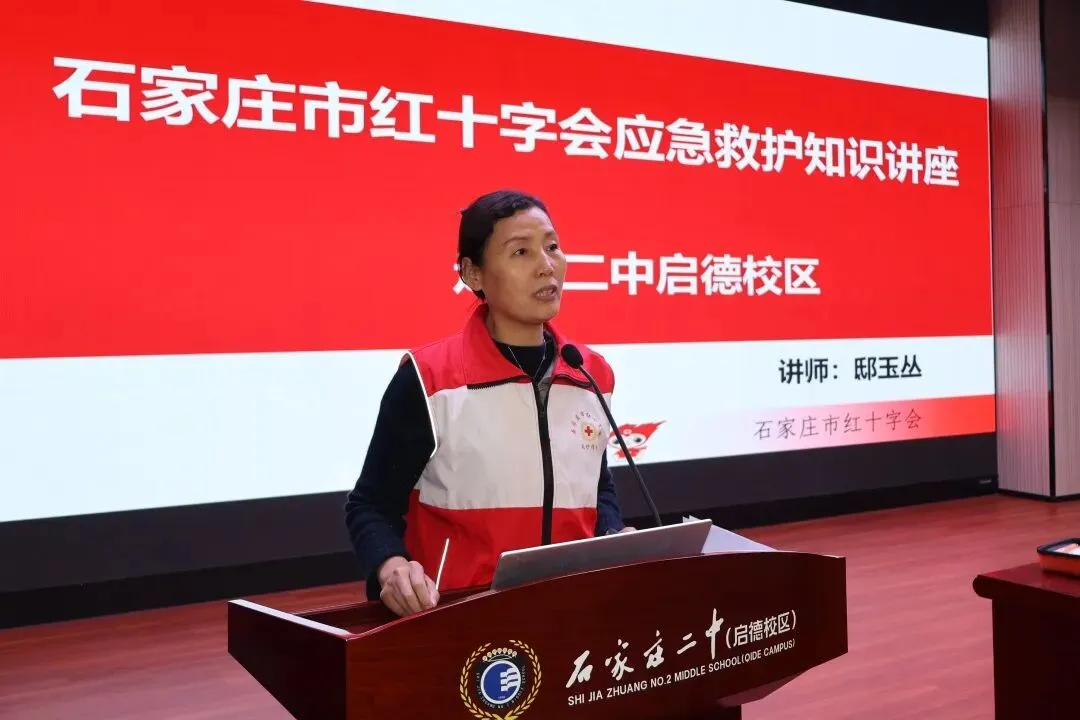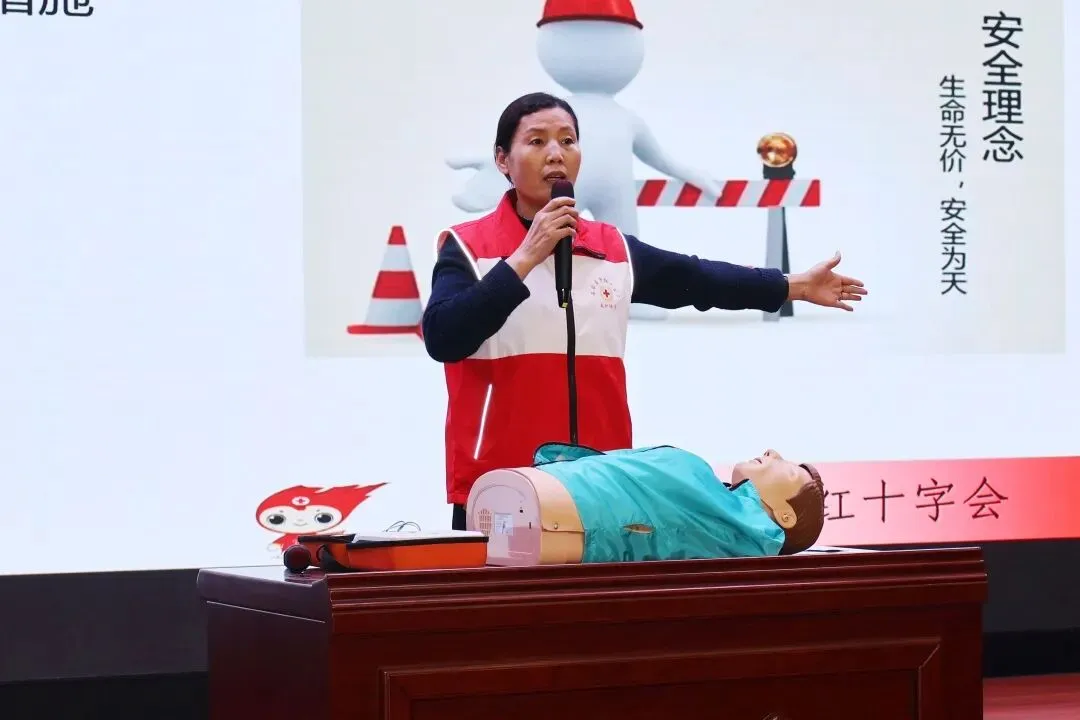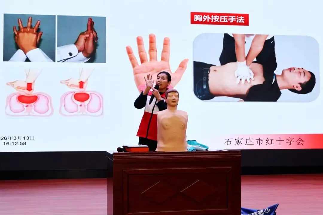本次培训特邀红十字会的邸玉丛讲师主讲。邸老师是石家庄市红十字卫生救护培训中心应急救护三星级师资,同时也是中国红十字会国际认证师资。凭借权威资质与丰富经验,她采用“理论授课+实操演练”的标准化教学模式,围绕心肺复苏(CPR)、自动体外除颤器(AED)使用、气道异物梗阻等常见意外处理的核心急救技能展开讲解,深入阐释“黄金四分钟”的生命救援原则,并以通俗语言拆解专业操作要点,让急救知识变得易学、易懂、易掌握。