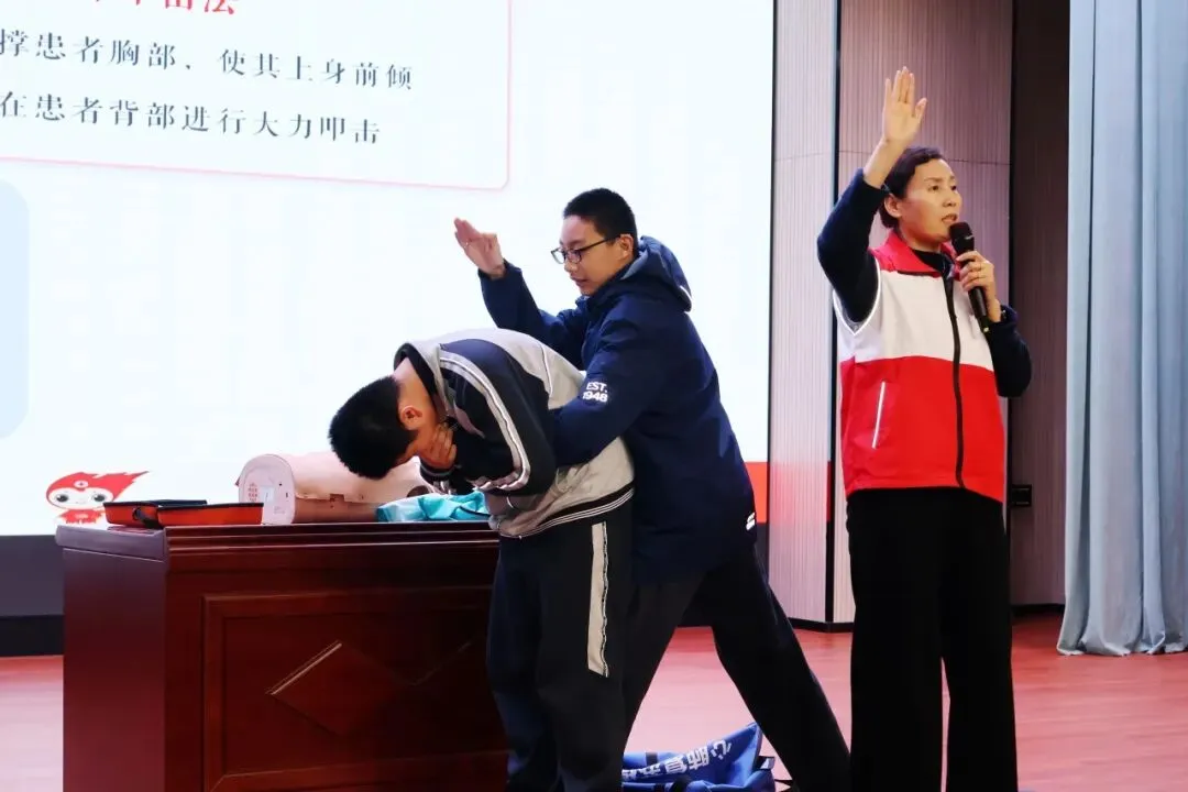 实操演练环节将现场气氛推向高潮。活动邀请学生代表上台,在模拟人身上进行实战演练,并接受邸老师的专业指导。从胸外按压的精准位置、深度与频率,到AED电极片的规范粘贴与操作,再到气道梗阻的紧急解除方法,邸老师逐一纠正动作偏差,耐心指导细节要点。参训师生全神贯注,反复练习,从生疏到熟练掌握,切实练就了实用的急救本领,现场学习氛围热烈而有序。
