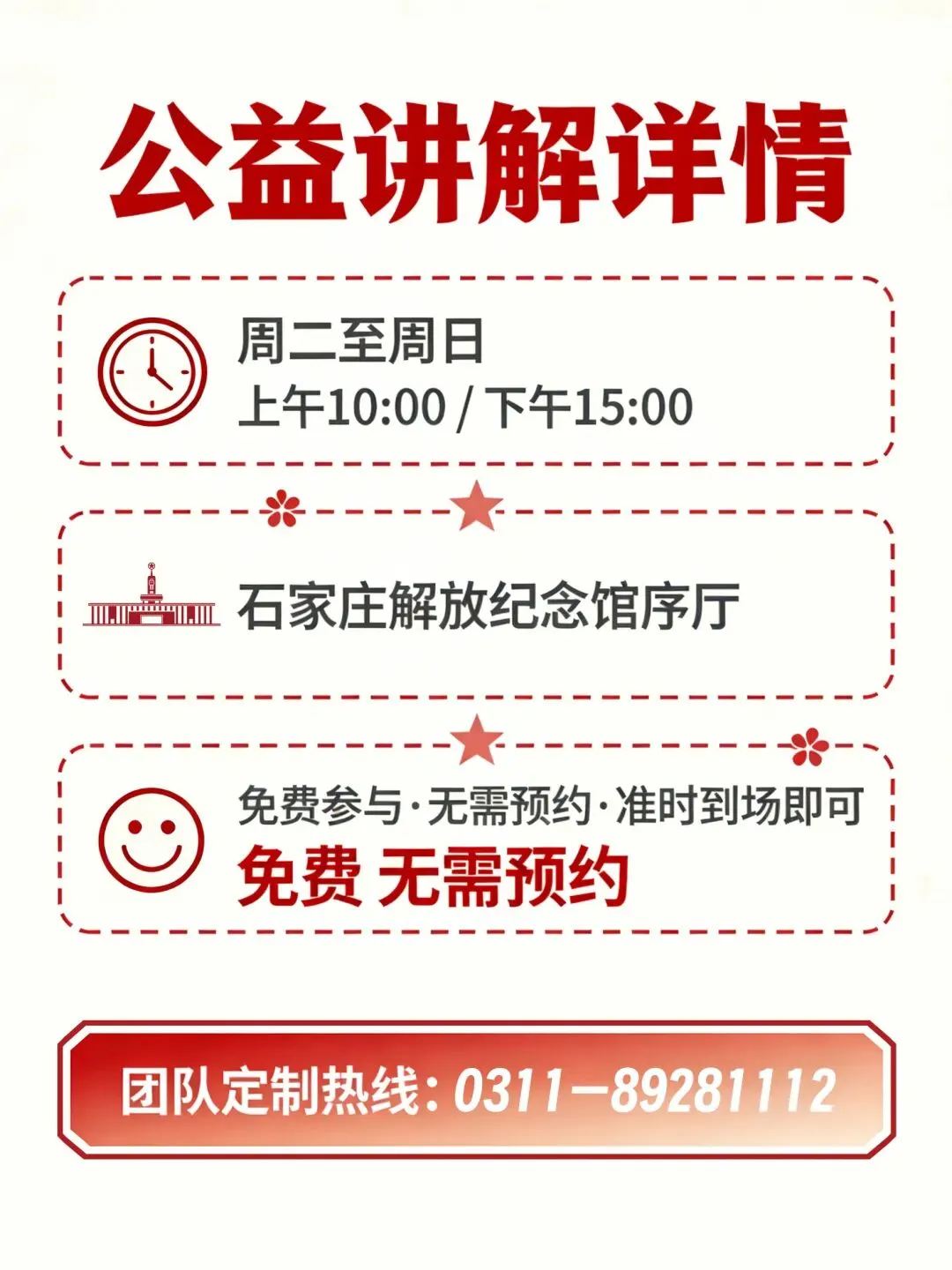 为方便广大观众深入了解红色历史,纪念馆提供免费公益讲解,时段为上午10:00、下午15:00;团队也可提前预约专属讲解服务,咨询预约电话:0311-89281112。