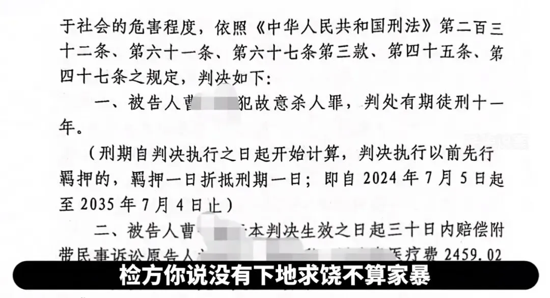 事后,当地检察院以故意杀人罪对曹女士提起公诉并判处11年有期徒刑。