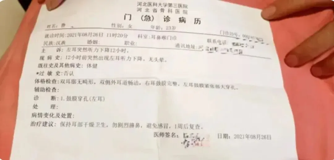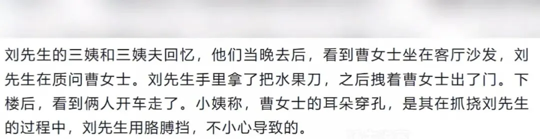 第一次家暴发生在2021年8月26,当晚曹女士让刘某洗脚再上床睡觉,便迎来一击耳光,这一巴掌导致曹女士耳膜穿孔。但男的下跪认错保证绝不再犯,为了不影响孩子曹女士没有选择报警。