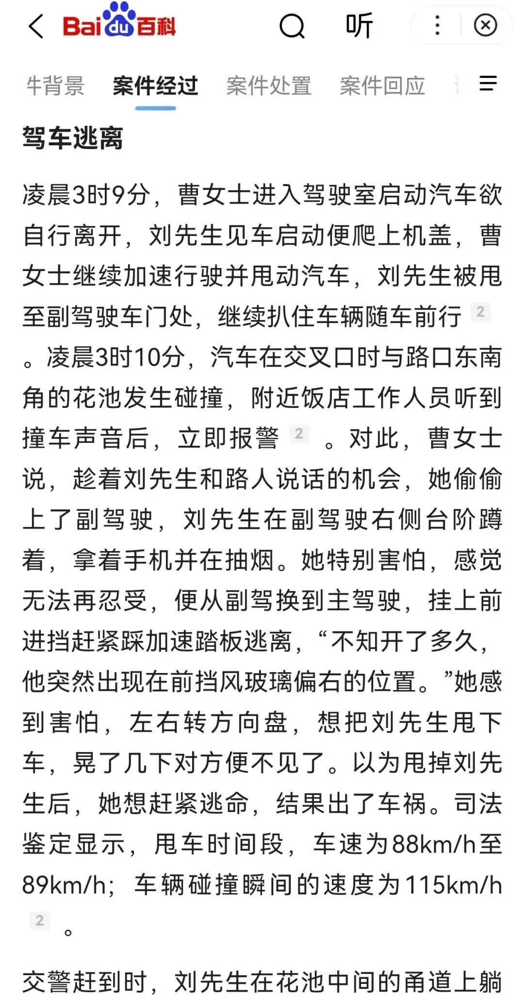 三个多小时的殴打令曹女士已经极度恐惧,她用最后一丝力气爬到驾驶室想驾车逃离。但没想到刘yh直接爬到汽车前机舱盖疯狂拍的挡风玻璃逼迫其停车,在极度恐慌下曹一边加速一边猛打方向盘想甩掉刘某,结果车辆在交叉路口撞上花坛刘被送往医院伤势过重抢救无效死亡。
