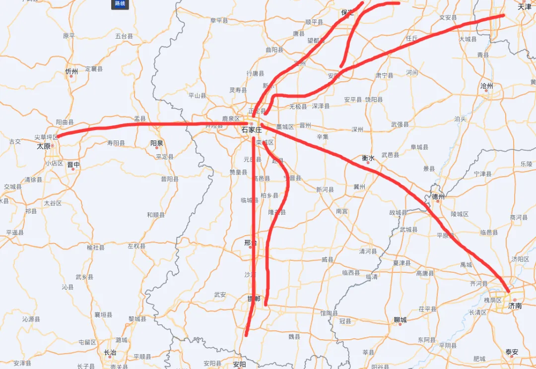 大家如果看下石家庄的铁路枢纽,和百年前一样,还是十字枢纽,没有发展成为类似郑州的米字形铁路枢纽,个人觉得有以下几点。首先就是地理位置,如果从石家庄一直向西,就到了银川,乌鲁木齐,非常近。但是全是大山,高原,太行山,吕梁山,黄土高原,祁连山,贺兰山等等。修路难度特别大。而最早的石太铁路,也是在山谷中,拐来拐去。虽然后来新建了石太高铁,但是也仅有200公里的时速。因此石家庄西部的铁路线只有一条,但是东部是大平原,为什么也是老样子呢。这就是另一个原因,大局为重。大家看下河北省地图,中间位置有两个不属于河北的大城市,北京,天津。虽然位于河北中心,但是不归河北管。有一个是首都。其实北京才是河北的中心。改革开放后,河北的道路交通,都是围绕首都建设规划的。可以发现,河北各地市之间,好多都没有铁路连通,甚至去省会也不方便,但是河北各地市都能便捷的到达北京。但是随着京津冀一体化,京津冀城市群的规划布局,石家庄的铁路枢纽迎来了大发展。第二,石家庄高铁规划
