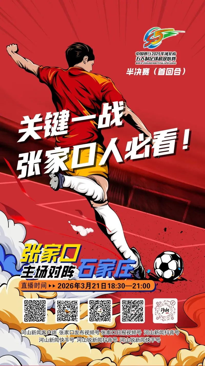 3月21日18点30分,“河北五超”半决赛(首回合)火热开踢,张家口队主场对阵石家庄队。为满足广大群众对家乡足球赛事的关注与热爱,“河山新闻”全平台特为您直播整场赛事。欢迎大家前往喜欢的平台观看直播!