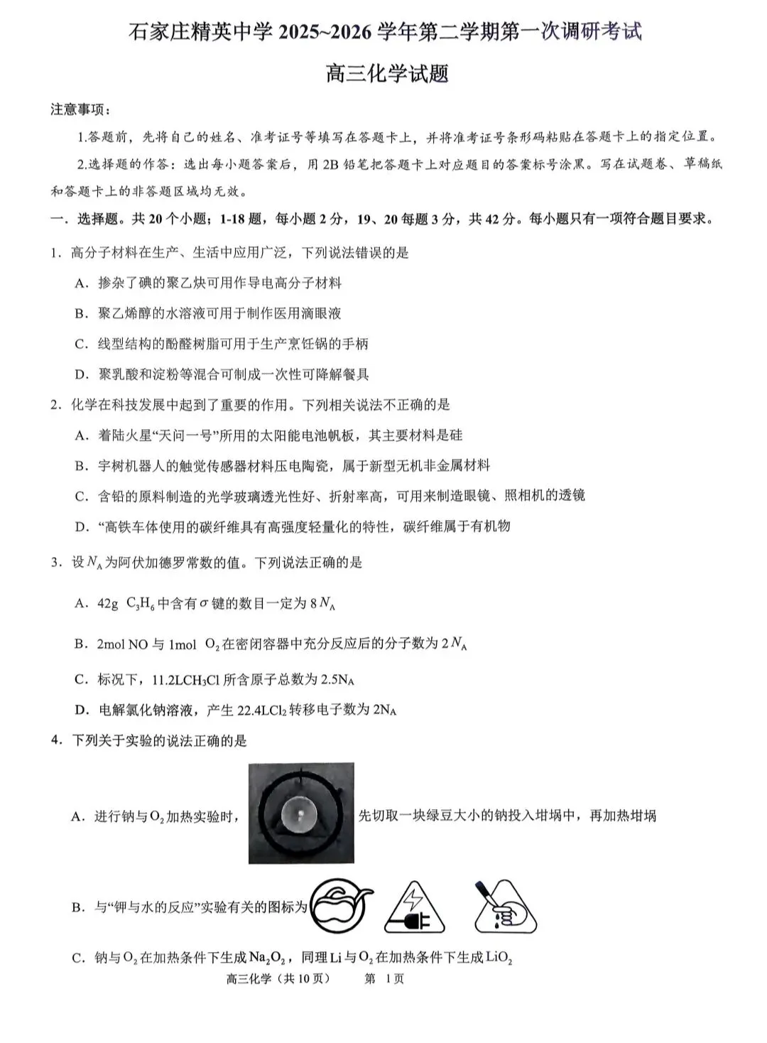 >河北省石家庄市精英中学等校2025-2026年高三下学期第一次调研考试化学试卷和答案.pdf