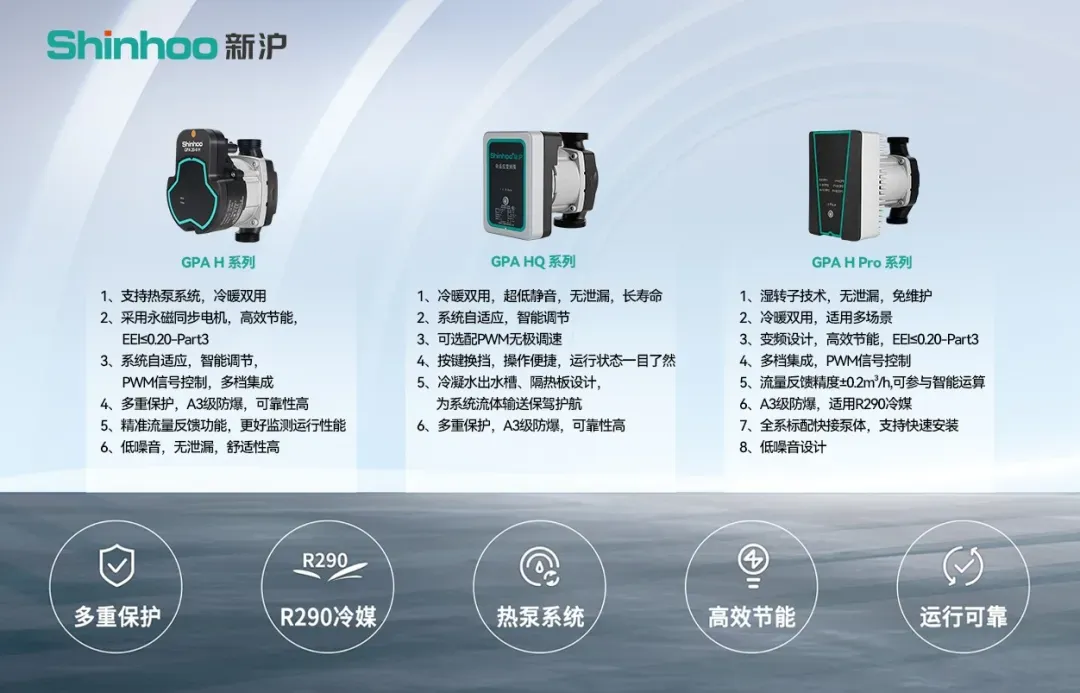 此次参展,新沪聚焦热泵行业核心需求,携多款热泵专用高效节能循环屏蔽泵明星产品亮相,涵盖GPA H Pro系列、GPA HQ系列等主力机型,全面展现其在热泵配套领域的技术积淀与产品优势。针对北方寒冷地区热泵系统冬季运行难题,新沪热泵专用循环泵可在-30℃严寒环境下稳定运转,同时适配R290等环保制冷剂系统,契合全球制冷剂替代趋势。搭载先进永磁同步电机,能耗较传统水泵大幅降低,具备无泄漏、低噪音、智能适配等优势,可广泛适配空气源、地源热泵及两联供系统,精准匹配建筑供暖、商业用热等多元场景需求。