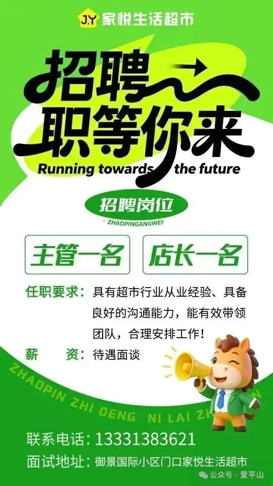 【家悦生活超市】诚聘英才!现面向全城招募店长1名、主管1名。要求:有超市行业经验,懂管理、善沟通着优先。薪资待遇面谈,空间拉满!期待有能力的你,加入我们一起共创未来!地址:御景国际小区门口家悦生活超市️,咨询联系13331383621