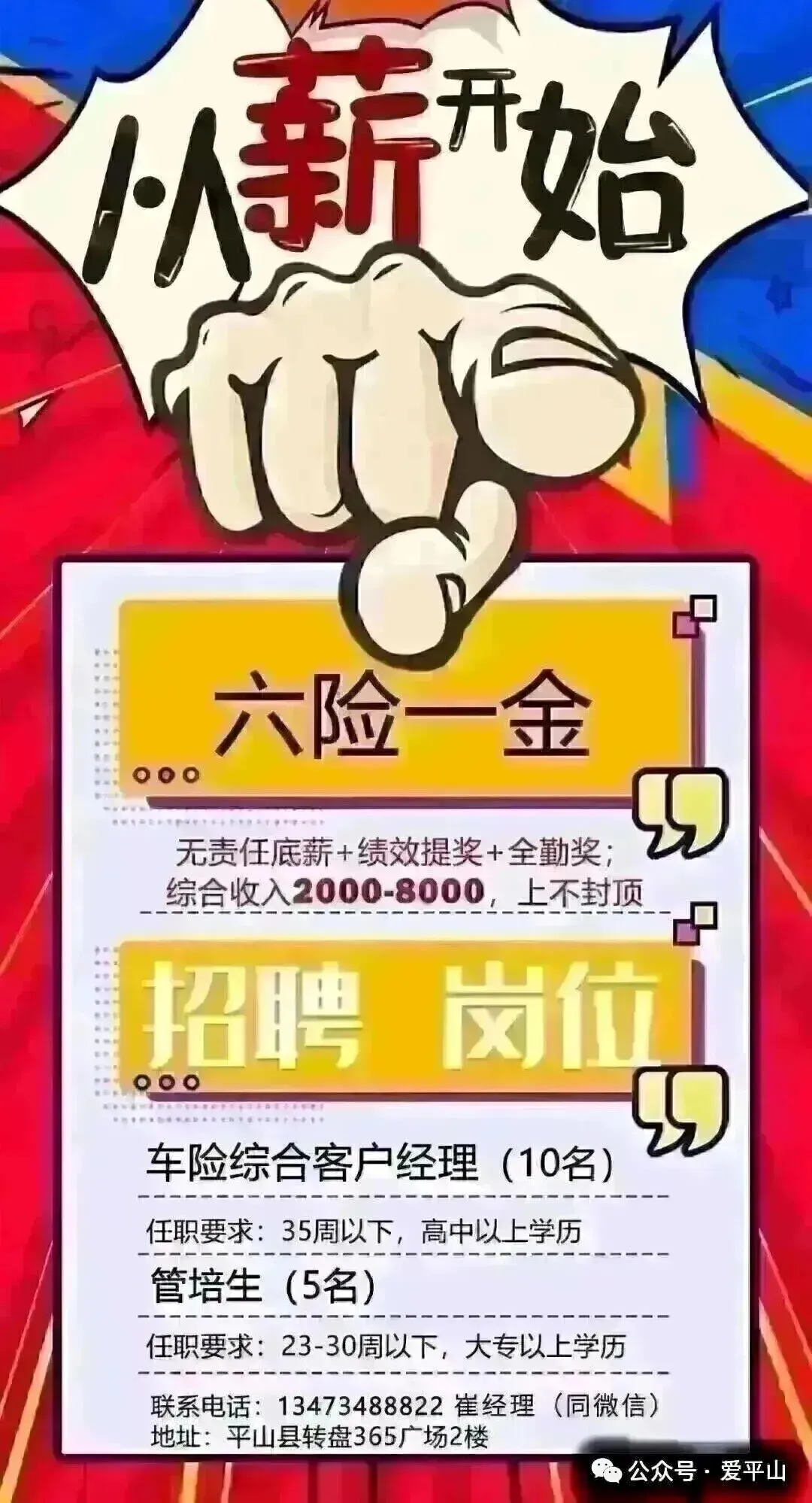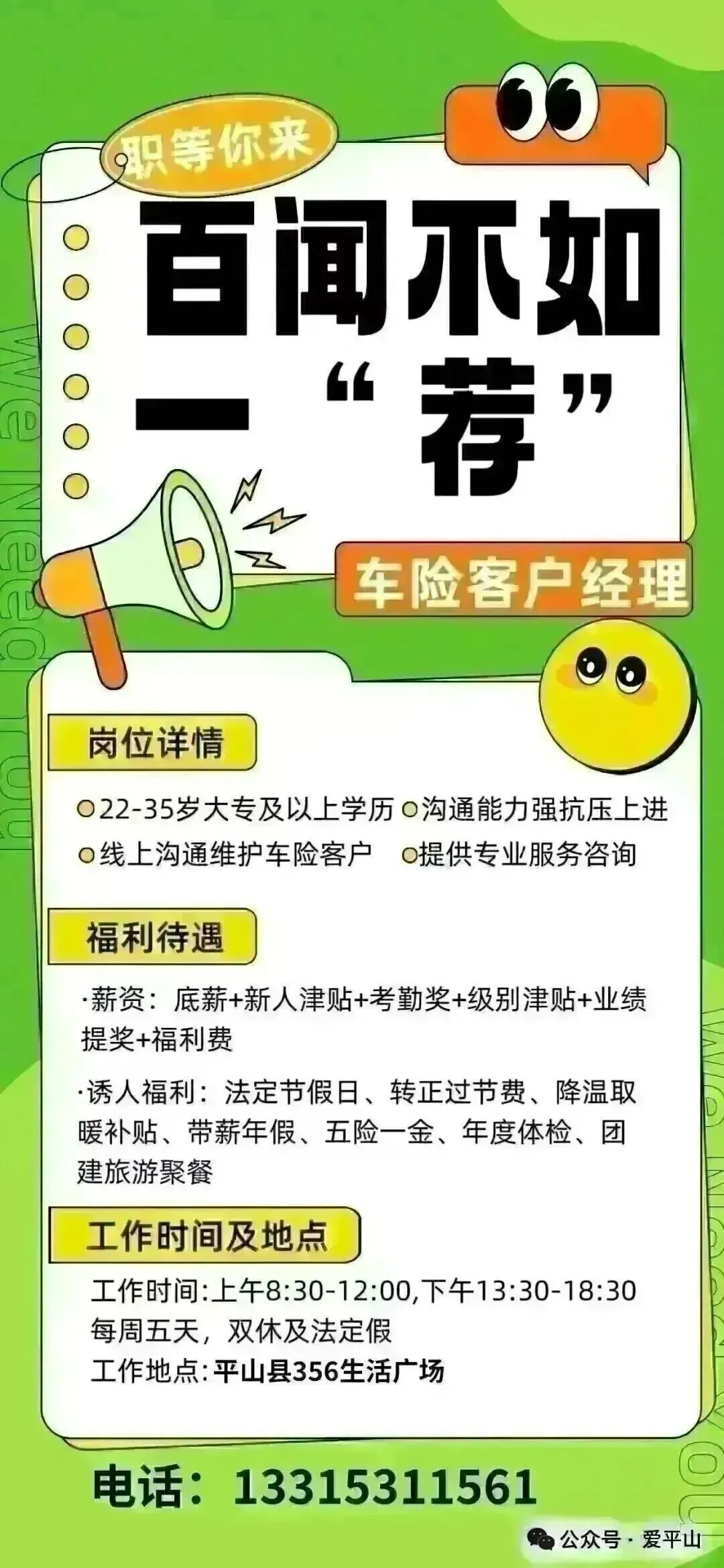 (0520)岗位介绍1、岗位名称:车险客户经理2、工作职责:与客户沟通,达成车险维护(无需外出)合规处理客户问题,详细、准确记录客户接触过程和信息,为客户提供快速、准确与专业的服务及咨询服务完成公司和上级领导安排的辅导和训练,通过培训考试与技能通关。3、任职资格:年龄在18-35周岁,大专及以上学历(优秀者可放宽)普通话标准,善于沟通,抗压能力强,积极有上进心,无不良嗜好,无违法犯罪记录有客服、销售等经验者优先。福利待遇 1、薪资结构:底薪(1300)+新人津贴(1200享受前3个月)+考勤奖(150)+业绩提奖(3个月后)+福利费,入职1年后综合薪资在6000-10000元之间2、诱人福利:享受国家规定的正常节假日,转正后可享受过节费(春节、五一、端午、中秋等)公司提供降温取暖补贴,享受带薪年假五险一金+年度免费体检定期组织各种户外团建、旅游、聚餐活动工作时间 1、正常工作时间:上午8:30-12:00下午13:30-18:302、一周五天,周六日双休,享受国家法定节假日工作地址:平山县356生活广场电话:13315311561