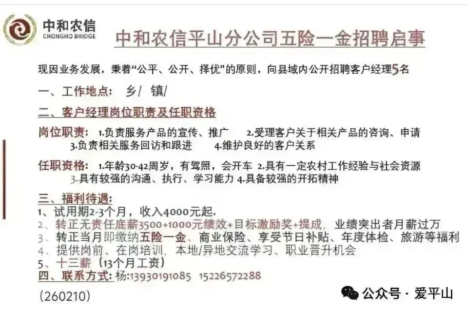 中和农信平山分公司招聘 五险一金 无责任底薪3500+1000绩效+激励奖+提成