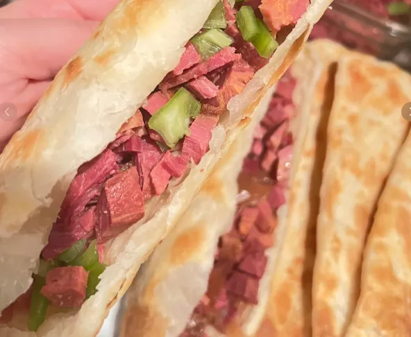 吃法也简单,别急着一口咬到底。先把饼对半掰开,让热气散一散,再加一点蒜泥或辣椒。第一口只咬边缘,尝脆皮和肉汁的对比,第二口再咬深一点,你会知道它为什么能在北方的风里站这么多年。