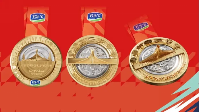 奖牌整体造型为圆型设计,“石家庄”三字环绕成圆,如同一枚独特的城市印章,把归属感凝于胸前。以城市之名,为跑者加冕。