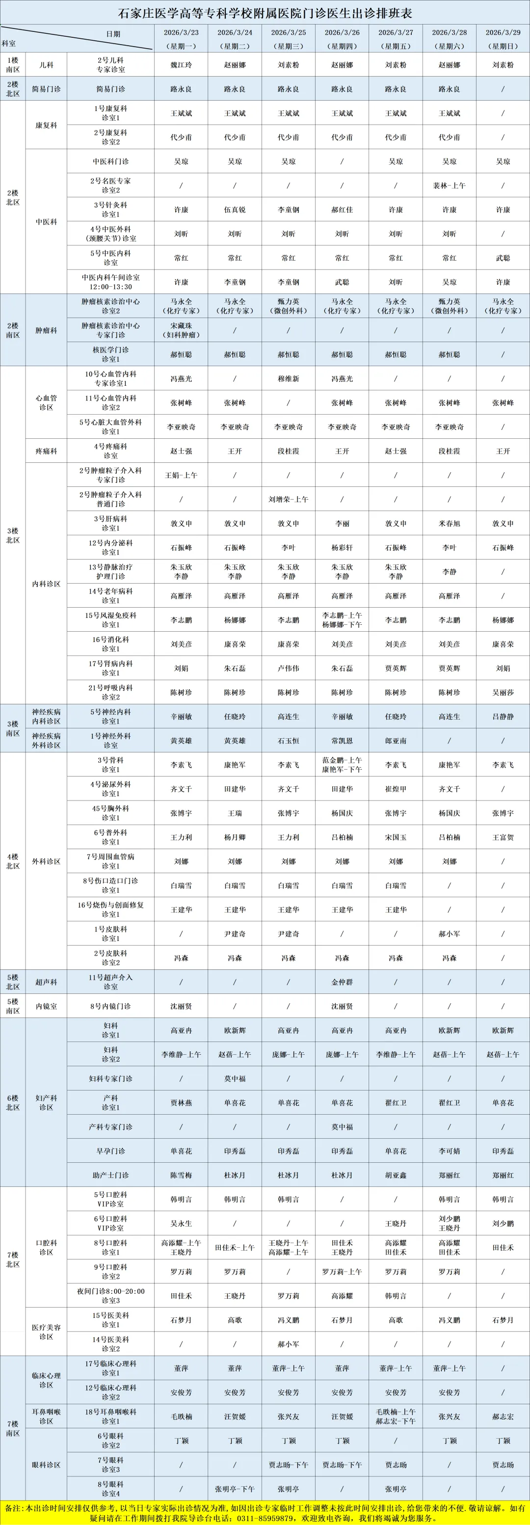 医院开设预防保健科、内科、外科、妇产科、儿科、眼科、耳鼻喉科、口腔科、皮肤科、医疗美容科、肿瘤科、急诊科、重症医学科、康复科、麻醉科、医学检验科、病理科、医学影像科、中医科等50余个一、二级临床、医技科室,能够完成疑难、危重患者的多学科综合治疗。