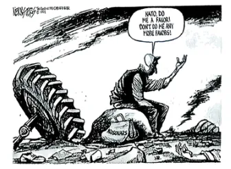 16.下图为20世纪末科索沃战争的一幅漫画。在遍地残骸中,一个枯瘦的人坐在废墟上,对着天空中的硝烟商量道:北约,帮我一个忙,别再帮我任何忙了!这反映出()