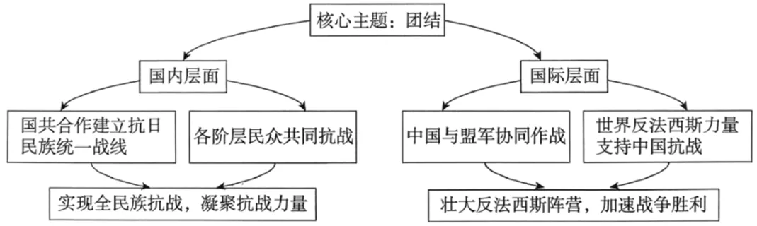 材料1945年,毛泽东在《论联合政府》中提道:“没有一个人民的军队,便没有人民的一切。可是这支军队,历来是和人民血肉相连的,它今天的胜利,是人民的胜利,是全体人民群众支持的结果。”团结,有“同心协力、众志成城”之意。抗日战争的胜利因团结而铸就,民族的复兴因凝聚力量而推进。下图反映了某学者以“团结”为主题认识抗日战争历史的思维导图。