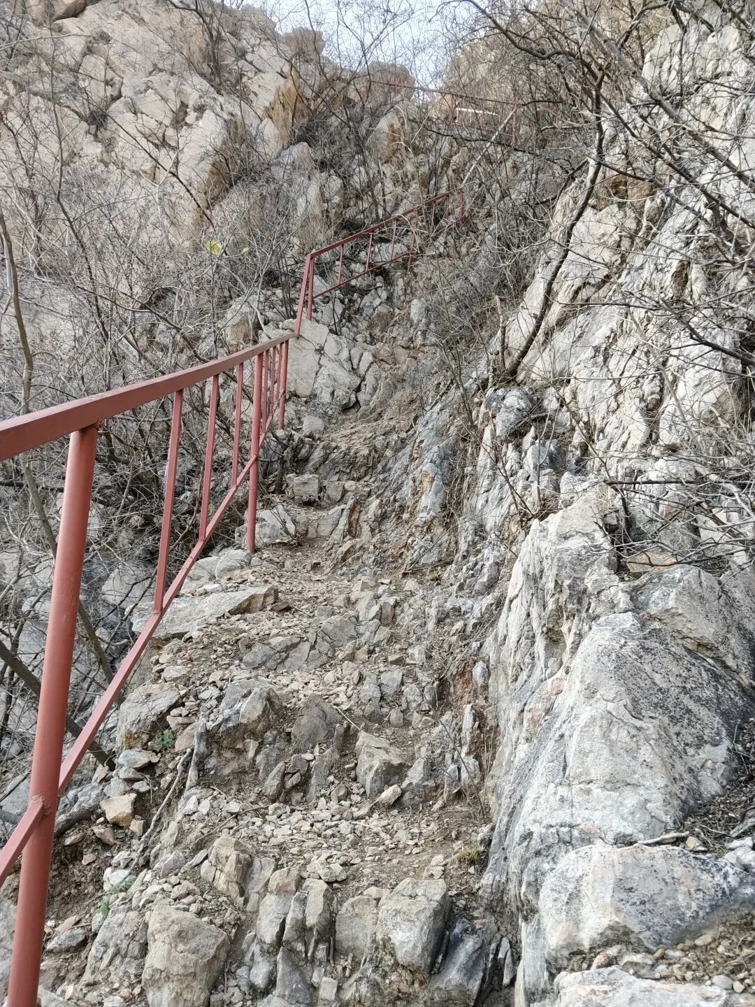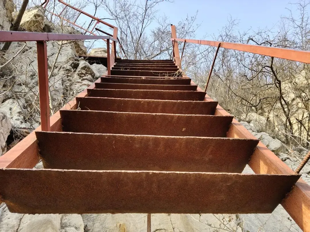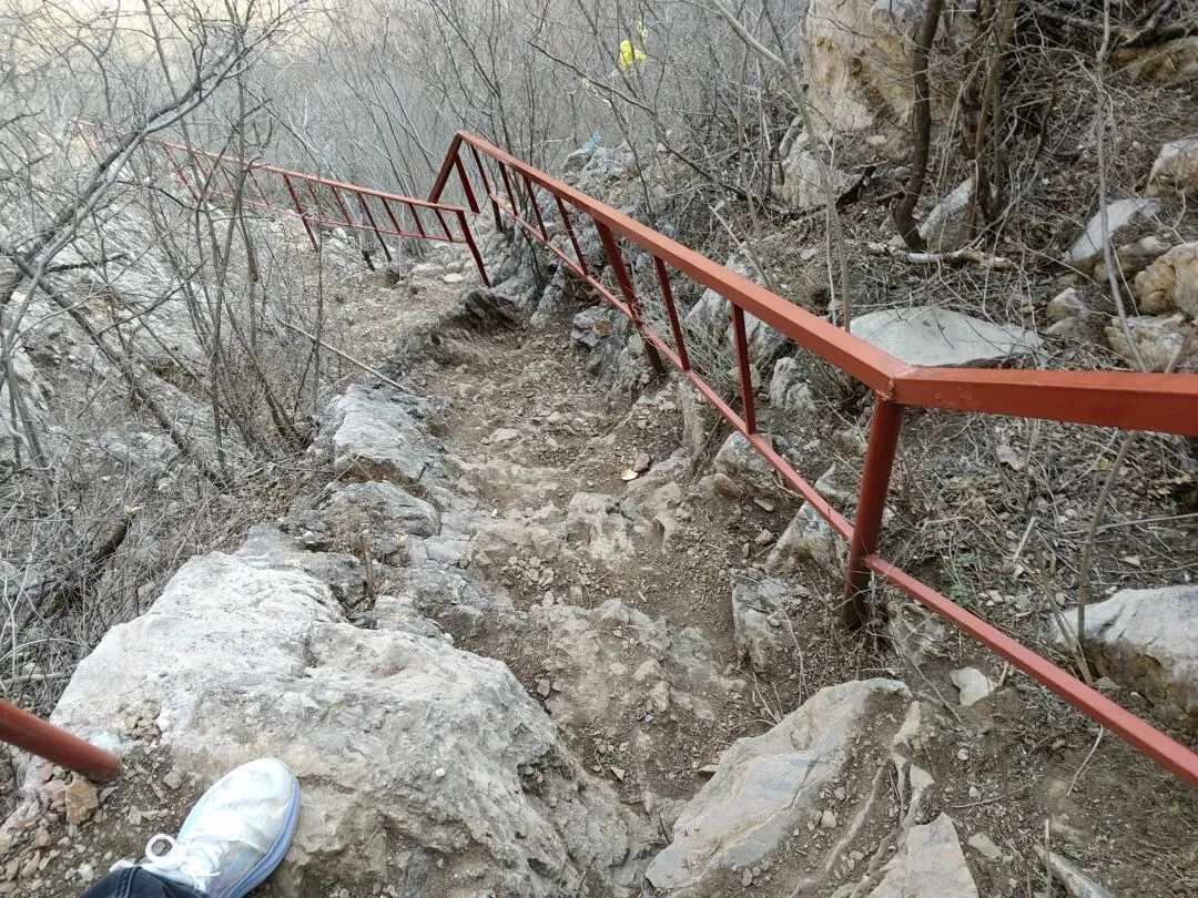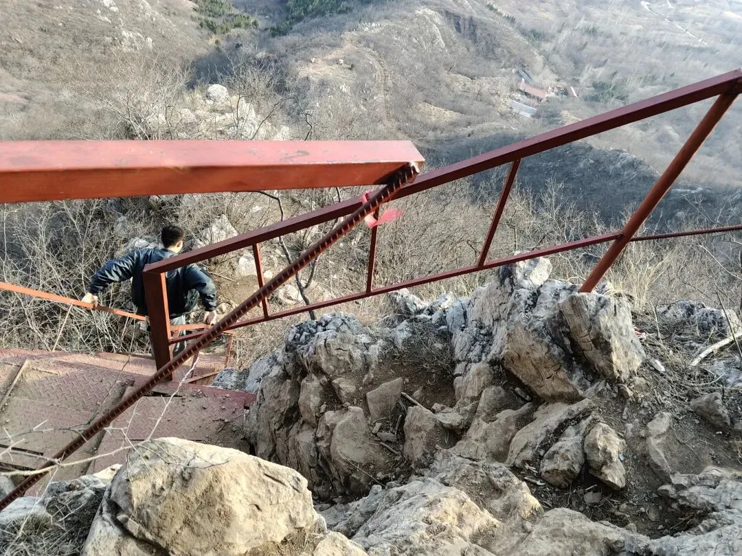 这边上山的路,真可算是山高路陡非常难走,好在有铁栏杆可扒