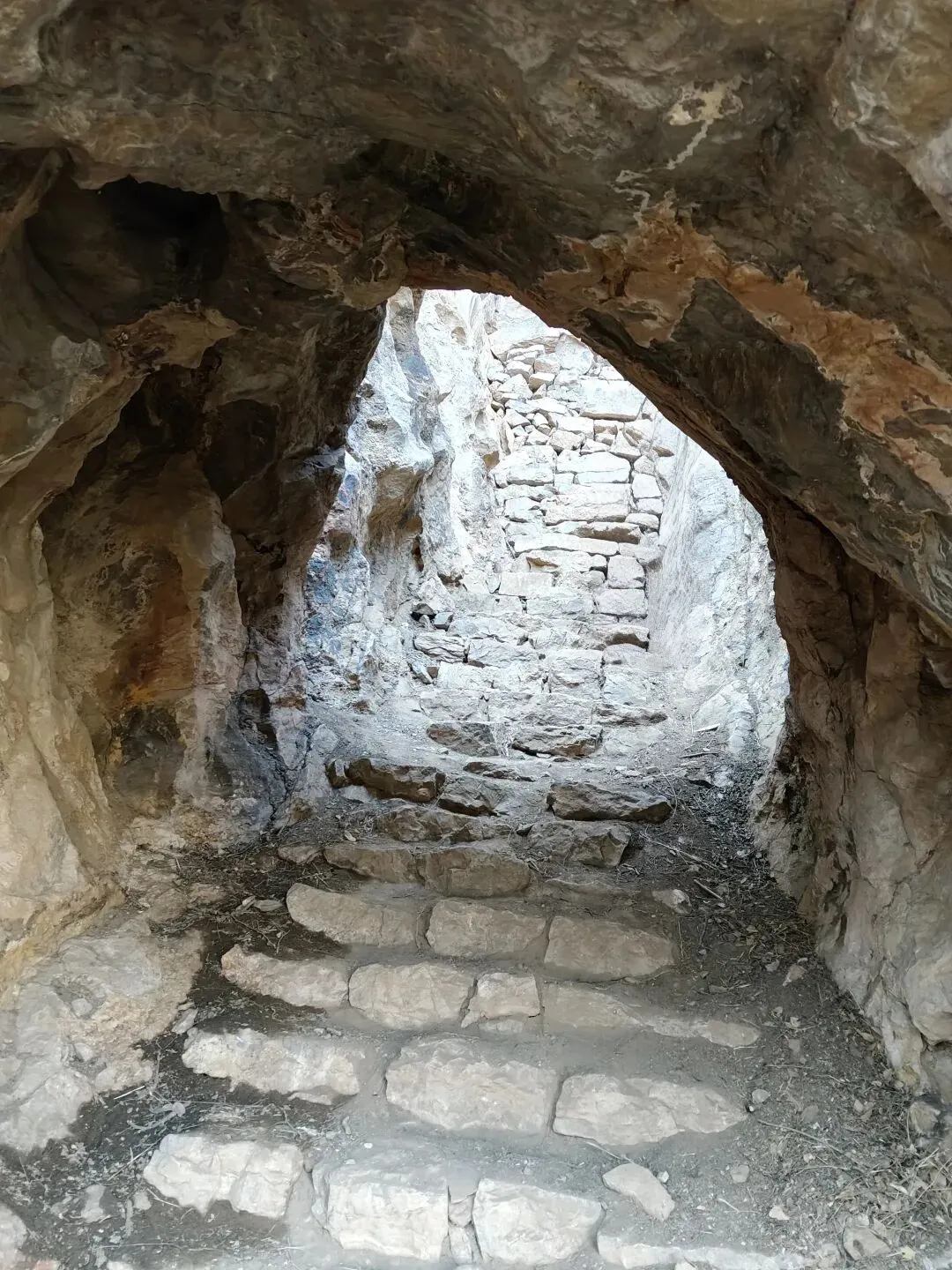 洞内上台阶,台阶全部用石头垒起,很陡!台阶上面的洞不算小,洞口边上还有梯子,走上去,上面还有个小洞~
