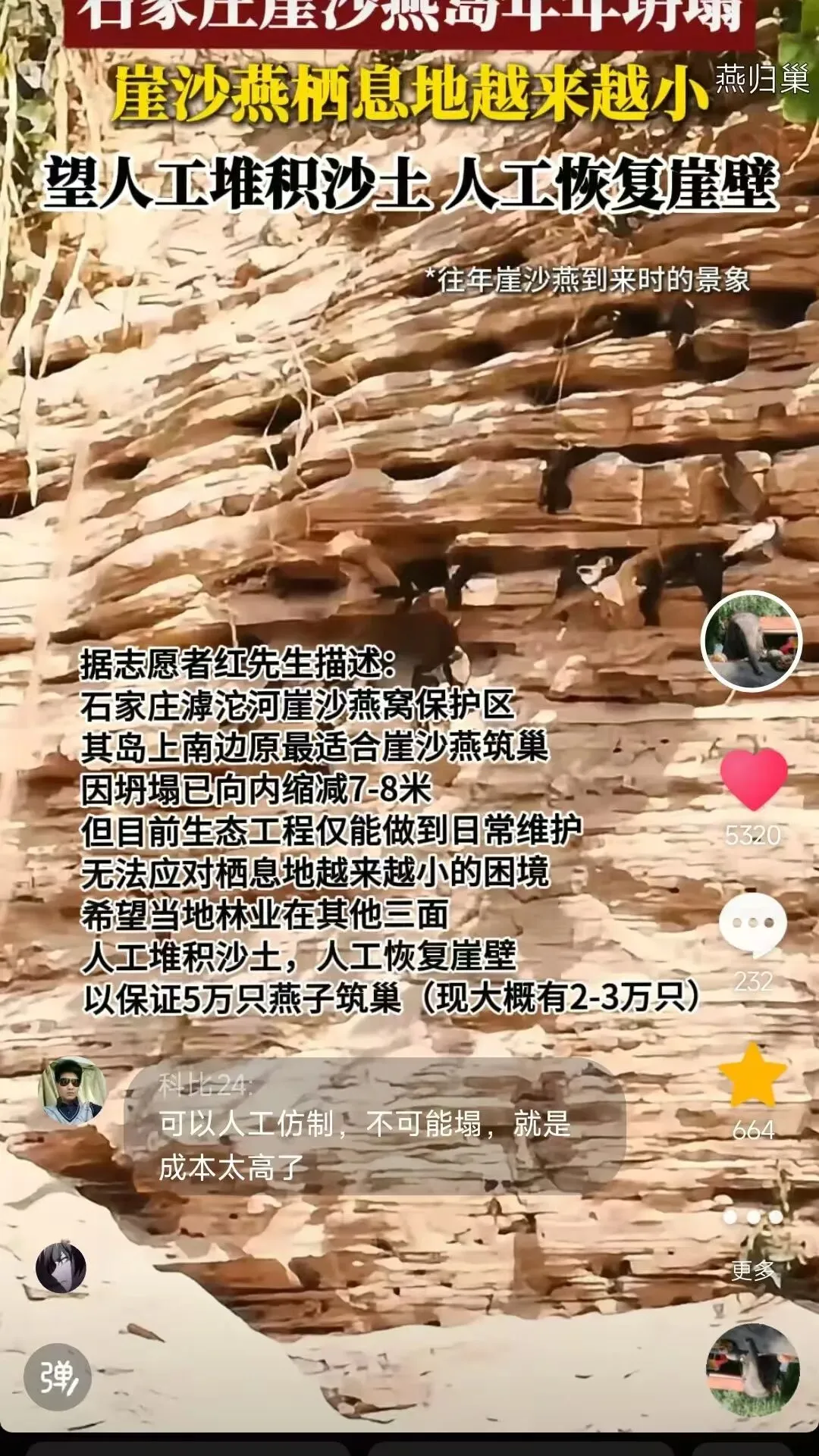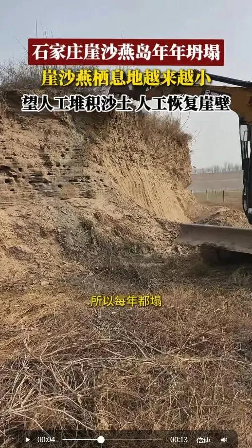 恳请你们正视滹沱河崖沙燕的生存绝境,扛起监管与保护责任,切实出钱、出人、出设备,牵头推进岛屿人工扩建与崖壁恢复工程,在岛屿其余三面完成沙土堆积、垂直崖壁打造,从根源上破解栖息地难题,让5万只崖沙燕有巢可筑、有家可回,保住这片华北地区珍贵的崖沙燕繁殖地。