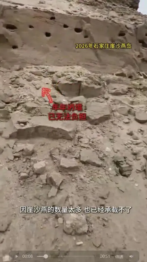因为栖息密度过大,岛屿年年坍塌,面积逐年缩小,尤其是岛屿南侧——这片最适合崖沙燕筑巢的核心区域,因为持续坍塌已经向后退缩了7-8米,彻底失去了筑巢条件;