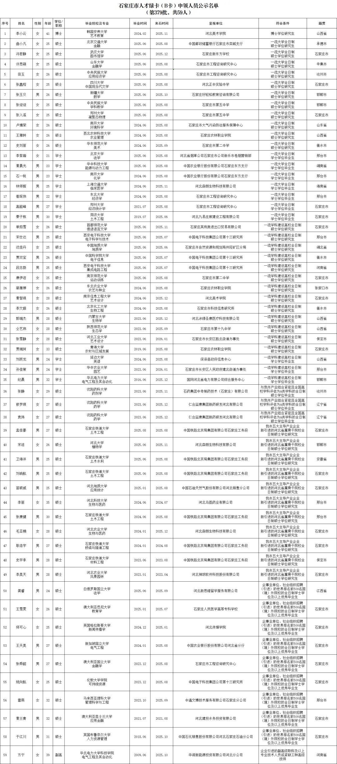 根据《石家庄市人才绿卡(B卡)管理办法(试行)》规定,经过本人申请、网上预审、单位审核、资格复审,拟为李小云等59名申请对象发放人才绿卡(B卡)。按照有关规定,现予公示,公示期截至2026年3月27日。如有问题请向石家庄市委组织部人才服务中心反映。