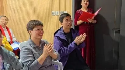 仪式伊始,现场播放暖场视频(背景音乐为合唱团成员创作的团歌)及经典MV《九九艳阳天》《亲爱的你啊》(由合唱团成员参与拍摄),悠扬的旋律瞬间将现场氛围烘托得温馨而热烈,为开班仪式拉开美好序幕。14时整,前奏音乐响起,由新华区组缪国茹、双习宁两位团员担纲的主持人登台,宣布仪式正式开始。
