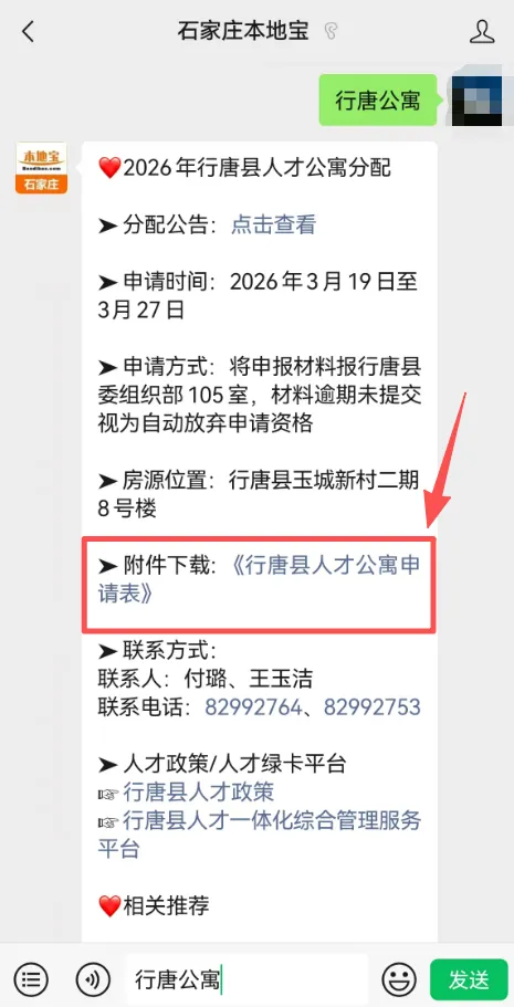 👉推荐服务:扫描或长按识别下方二维码,关注【石家庄本地宝】公众号,私信回复【行唐公寓】,即可获取《行唐县人才公寓申请表》下载入口、联系电话等。