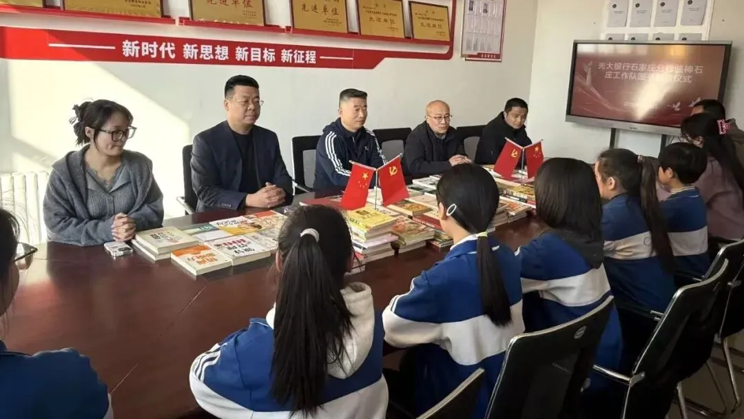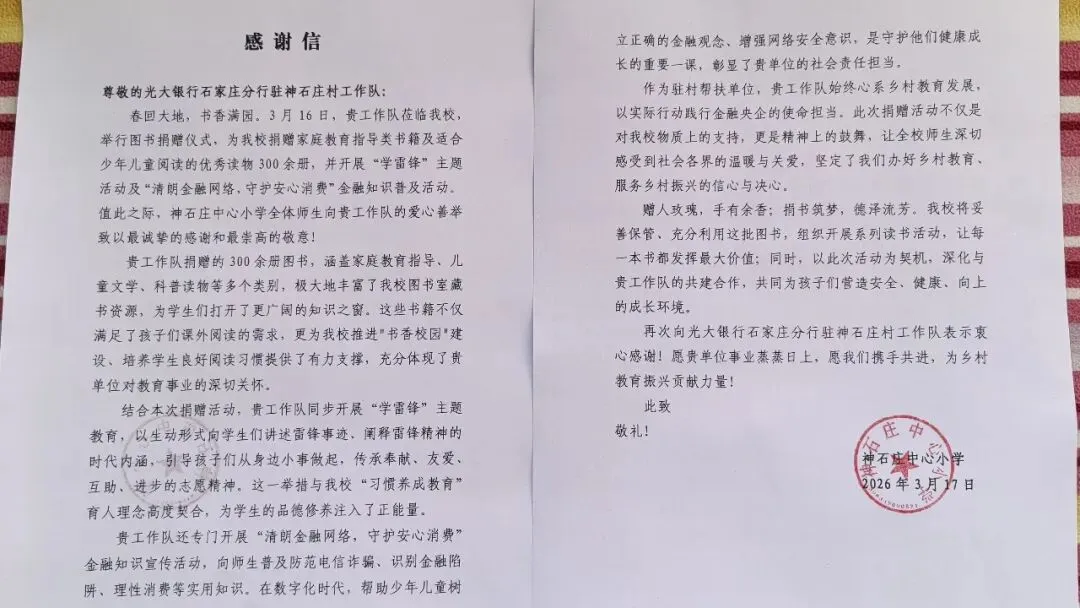 近日,石家庄分行驻村工作队到神石庄中心小学进行图书捐赠,并开展”学雷锋“主题活动及”清朗金融网络,守护安心消费“金融知识普及活动。