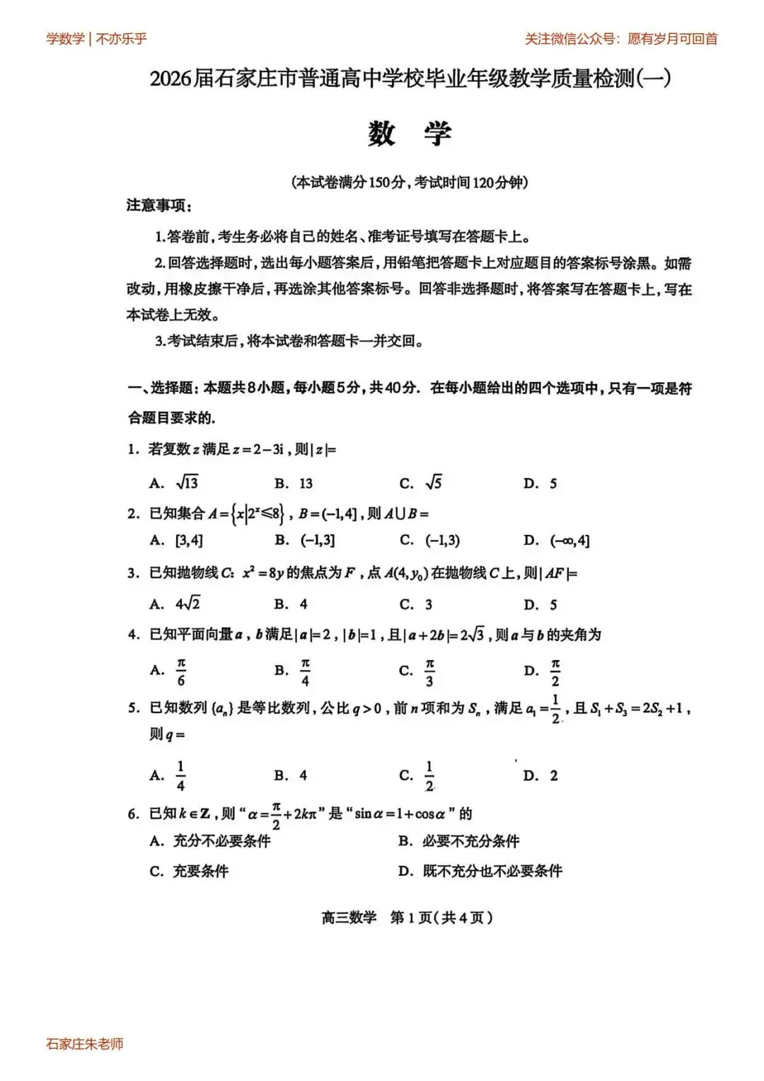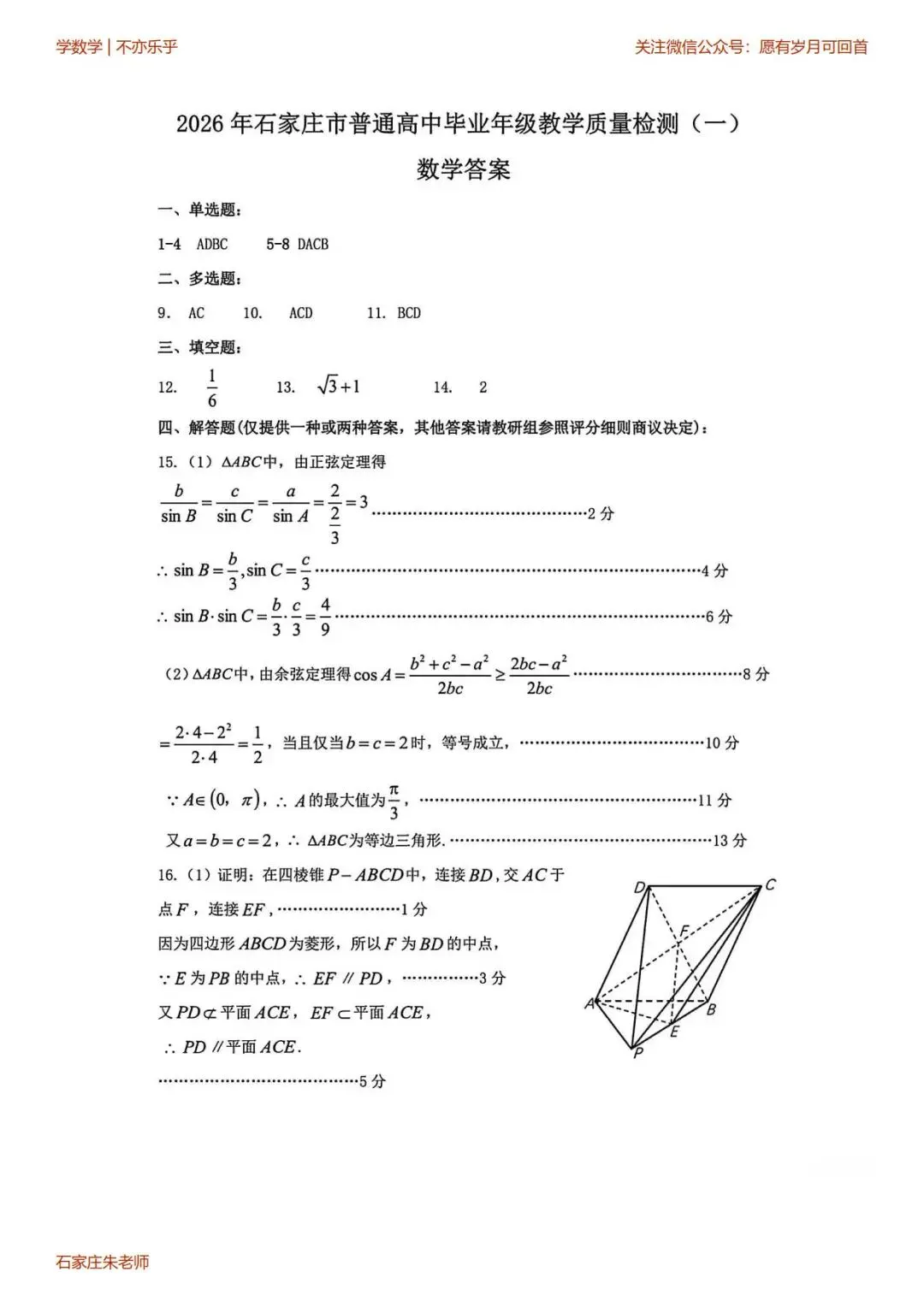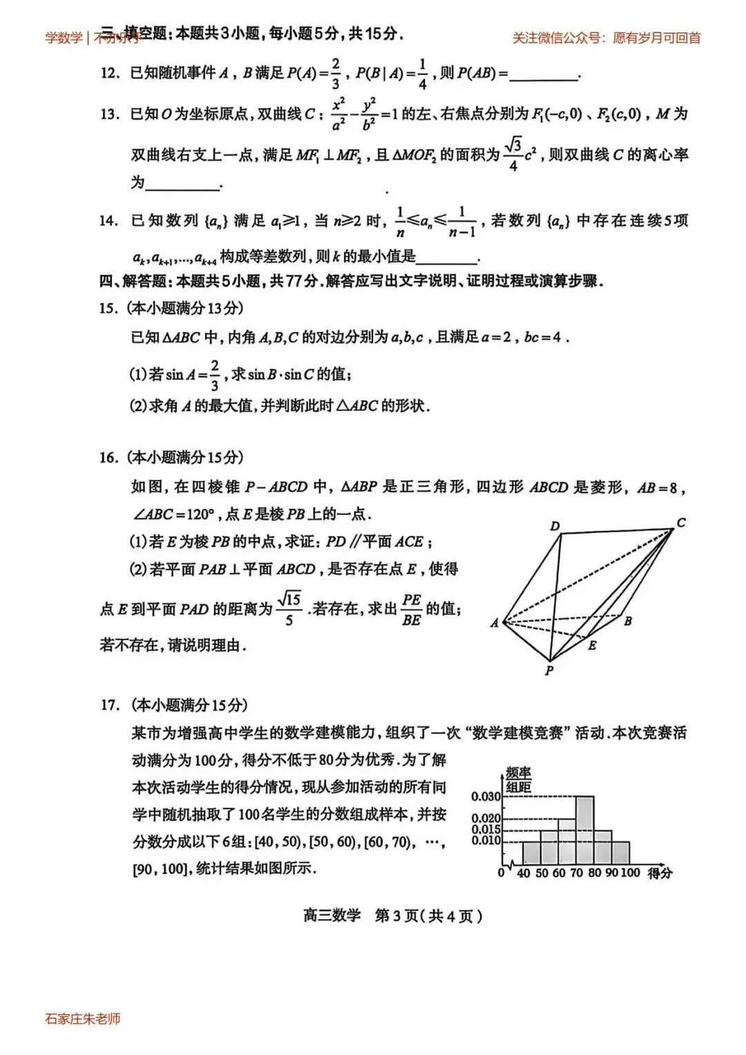 石家庄一模高三数学试卷(2026年3月)