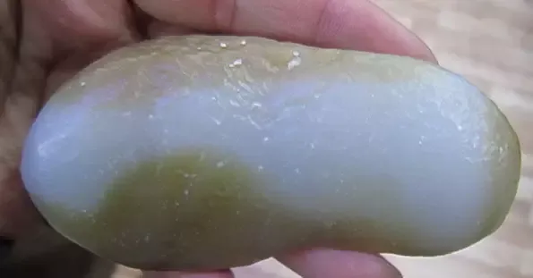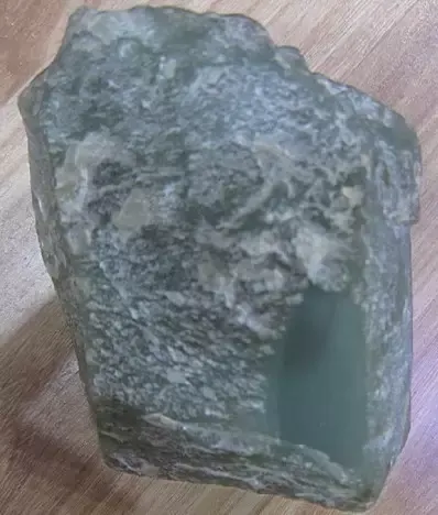 且末还有一种青玉,产于山上的小河里,极像河磨,外面包裹一层厚厚的石皮,玉质超极细。想出好玉全靠赌。这种青玉产量本就很少,再加上能切出理想玉质的就更少了,属于可遇不可求的。有幸赌中一块,给大家看看: