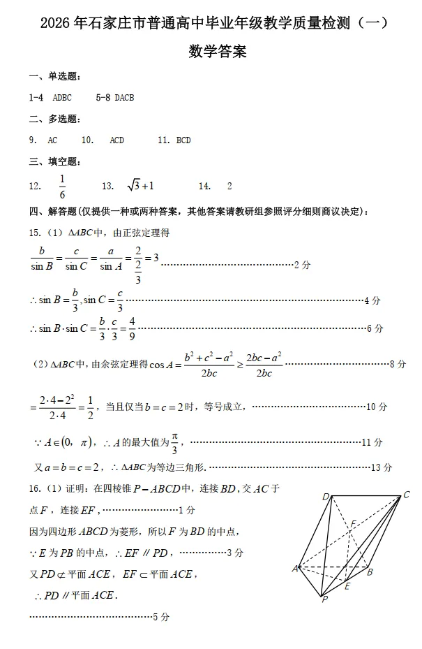 >【石家庄一模】2026届石家庄市高三教学质量检测一答案