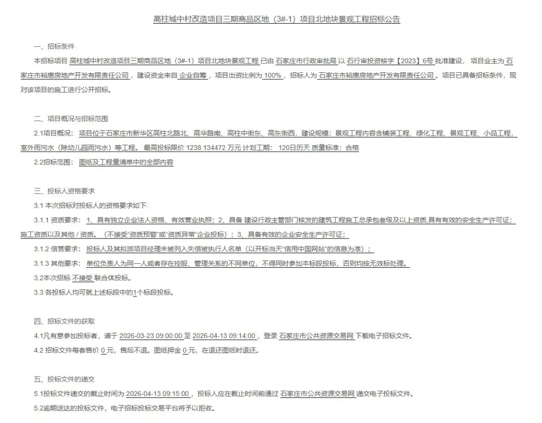 温馨提示:该项目位于石家庄市新华区高柱北路北、高华路南、高柱中街东、高东街西,就是城发投的云歌朗樾项目。该工程甲方为石家庄市裕惠房地产开发有限责任公司,市城发投下属企业。资金来源主要是企业自筹,回款应该不成问题。另一方面关于资质,景观工程施工内容主要包括铺装工程、绿化工程、景观工程、小品工程,室外雨污水(除幼儿园雨污水)等工程,投标前最好跟甲方沟通好。