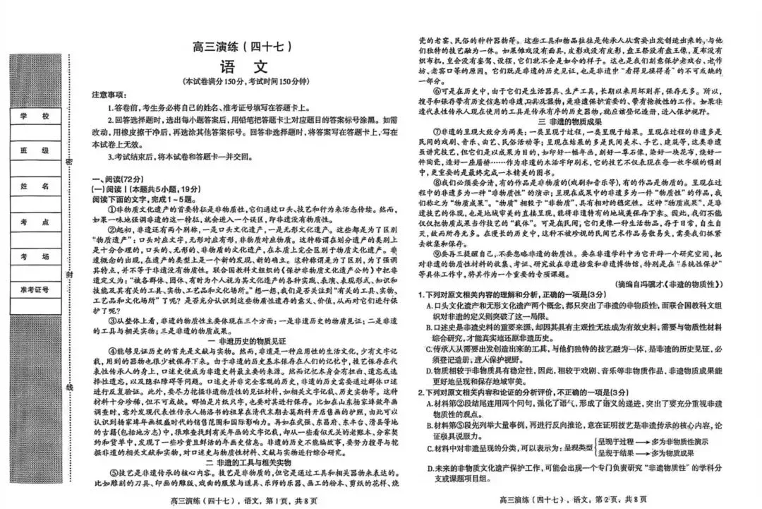 2.B【解析】第⑤段举例和推论,意在论证相关工具和器物既是非遗的历史见证,也是非遗中不可或缺的一部分,而非“技艺是非遗传承的核心内容”。