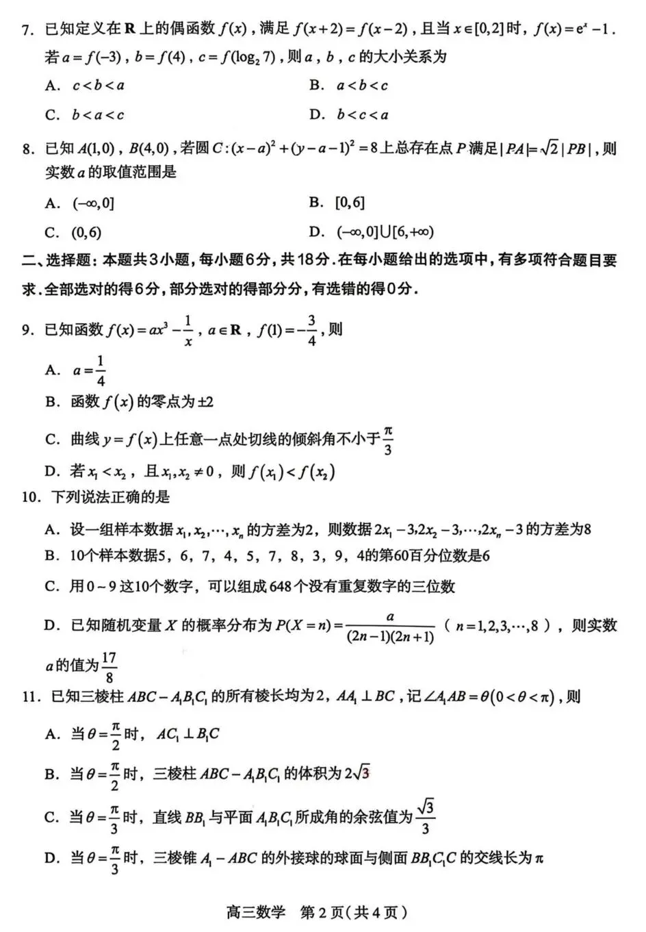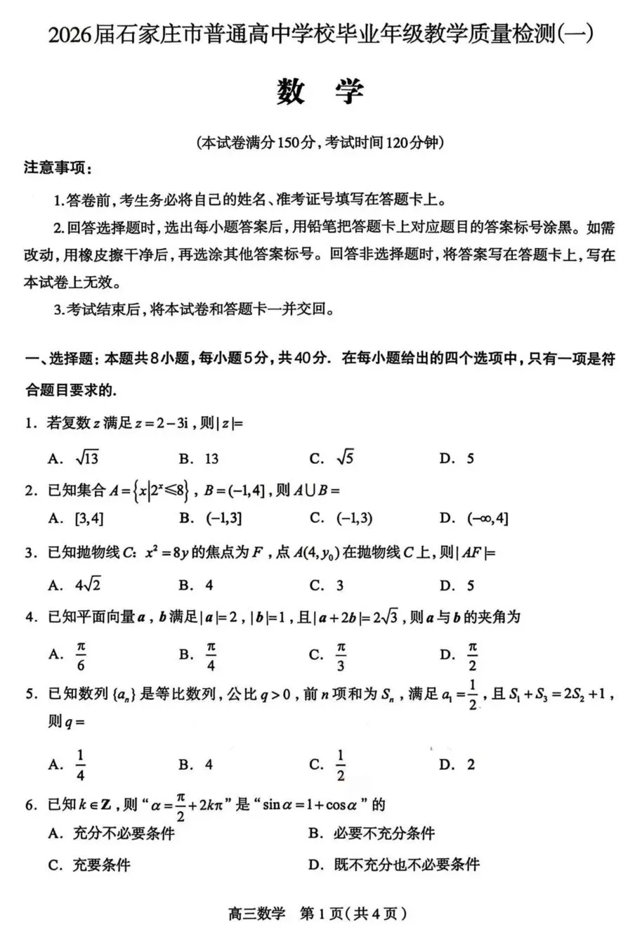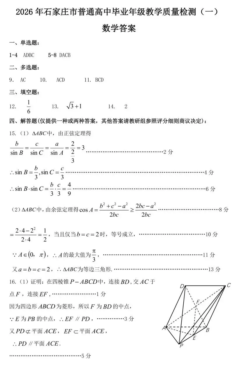 >河北省石家庄2026届普通高中学校高三年级教学质量检测一数学试卷及答案