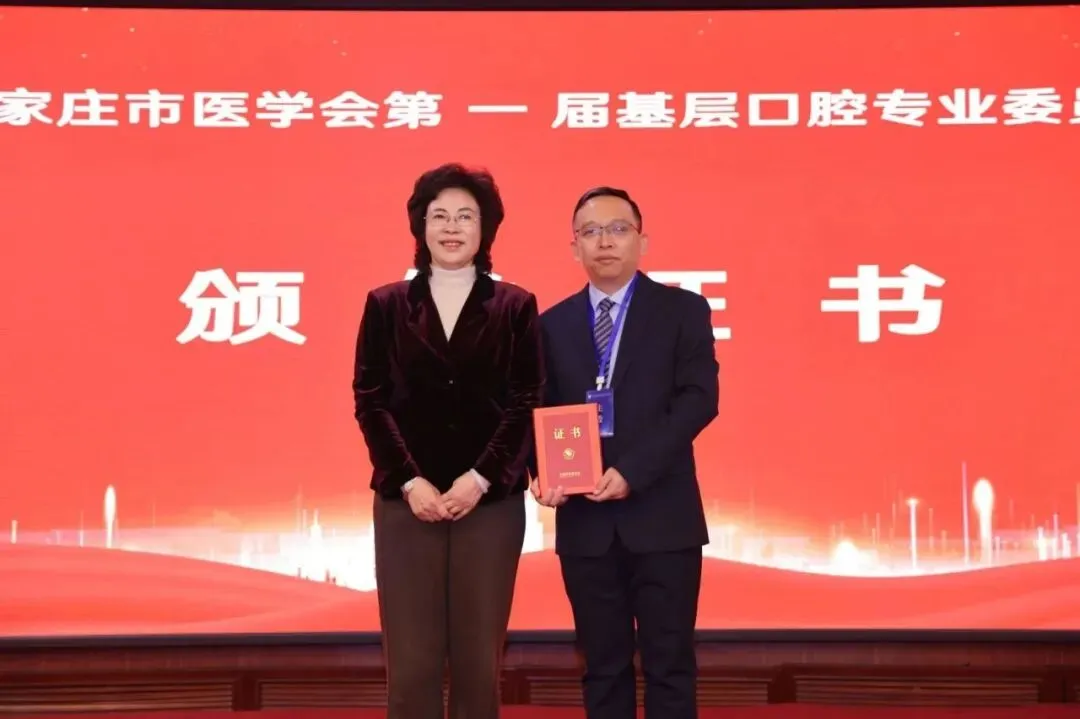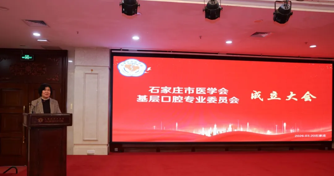 2026 年 3 月 20 日,石家庄市医学会基层口腔专业委员会成立大会暨第一届委员全体会议在石家庄顺利召开。作为石家庄市医学会七十余个专业委员会中规模最大的一次盛会,本次大会汇聚了全市基层口腔领域的专家学者与行业精英,共同擘画基层口腔医学事业发展新蓝图。在石家庄市医学会基层口腔专业委员会成立大会上,石家庄市医学会郭素萍副会长兼秘书长主持本次会议。会上,郭素萍秘书长首先介绍了出席本次大会的各位领导、专家及与会嘉宾,随后宣读了关于成立基层口腔专业委员会的正式批复文件。大会上,石家庄市医学会会长王云发表致辞,对专委会的成立表示热烈祝贺。她充分肯定了本次大会的深远意义,明确指出基层口腔专业委员会是市医学会所属规模最大的专业委员会,希望专委会切实发挥桥梁纽带作用,推动优质口腔医疗资源下沉,为提升全市基层口腔医疗服务水平贡献力量。授证履职:肩负使命再出发