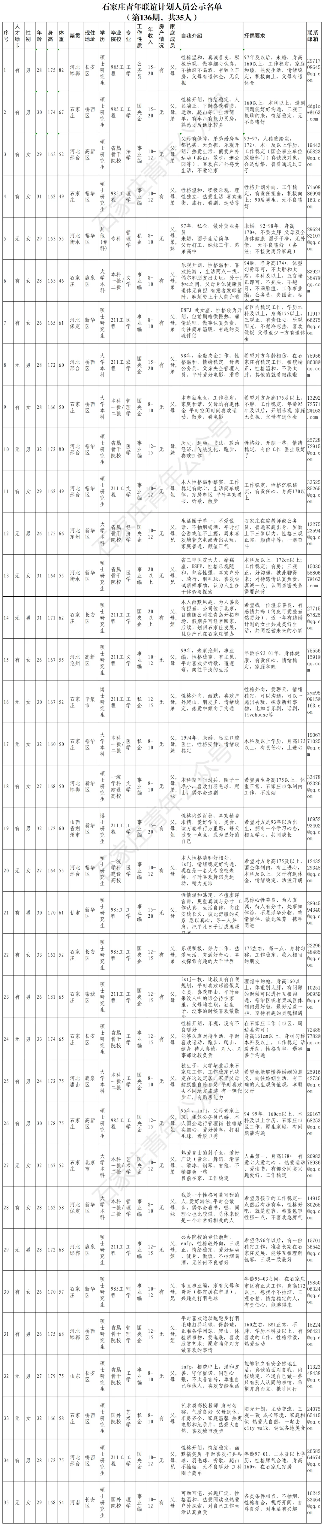 根据《石家庄青年人才公益联谊相亲计划》项目规划,经过本人申请、平台初审,现公示公开人员信息,符合择偶要求条件后请通过邮箱发邮件联系,以及参加后续交流活动。