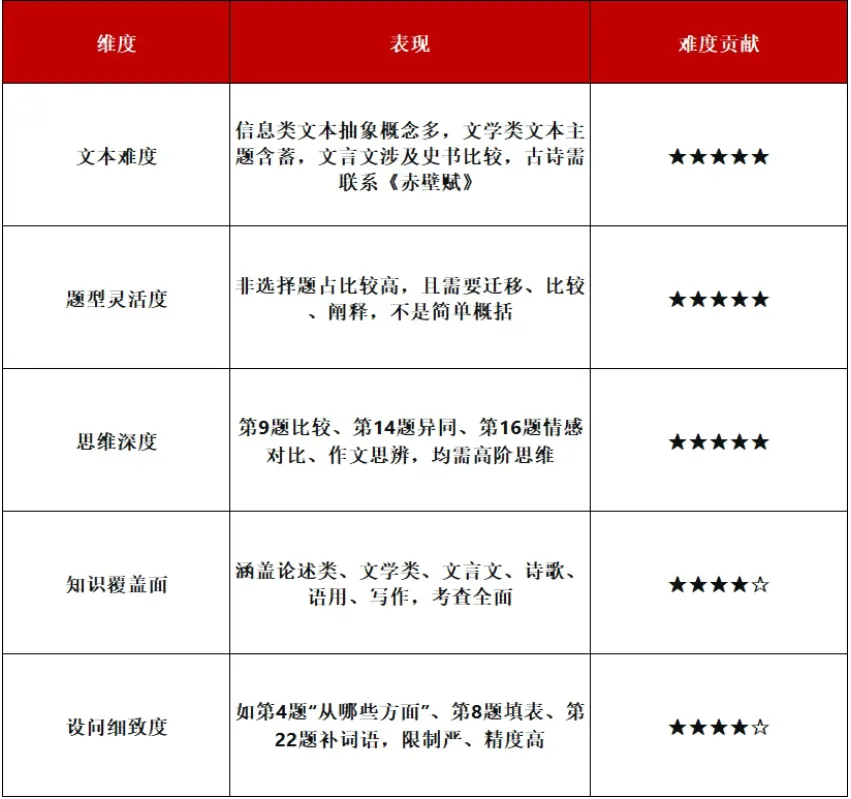 这套题整体风格接近新高考卷,选材新颖、设问灵活,对学生综合能力要求较高,尤其是信息类文本的深度理解、文言文比较阅读、文学类文本的复杂主题以及作文的思辨性。